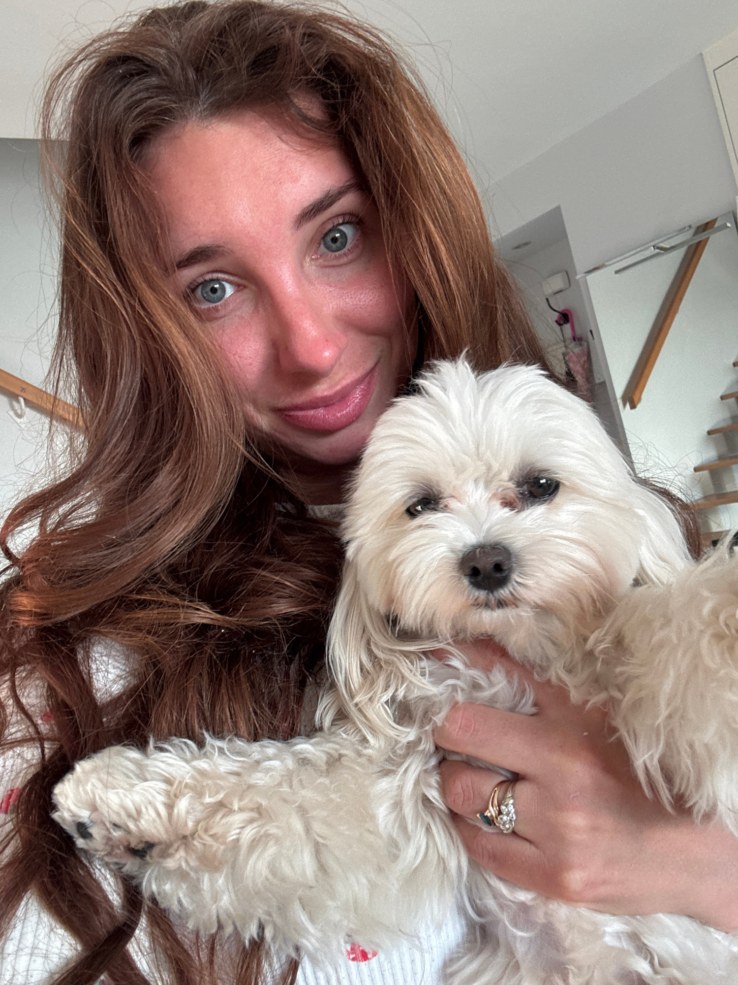 A young woman with long brown hair and blue eyes holds a small, fluffy white dog. The woman is wearing rings. The photograph is taken from a close, upside-down perspective. The location appears to be…read more