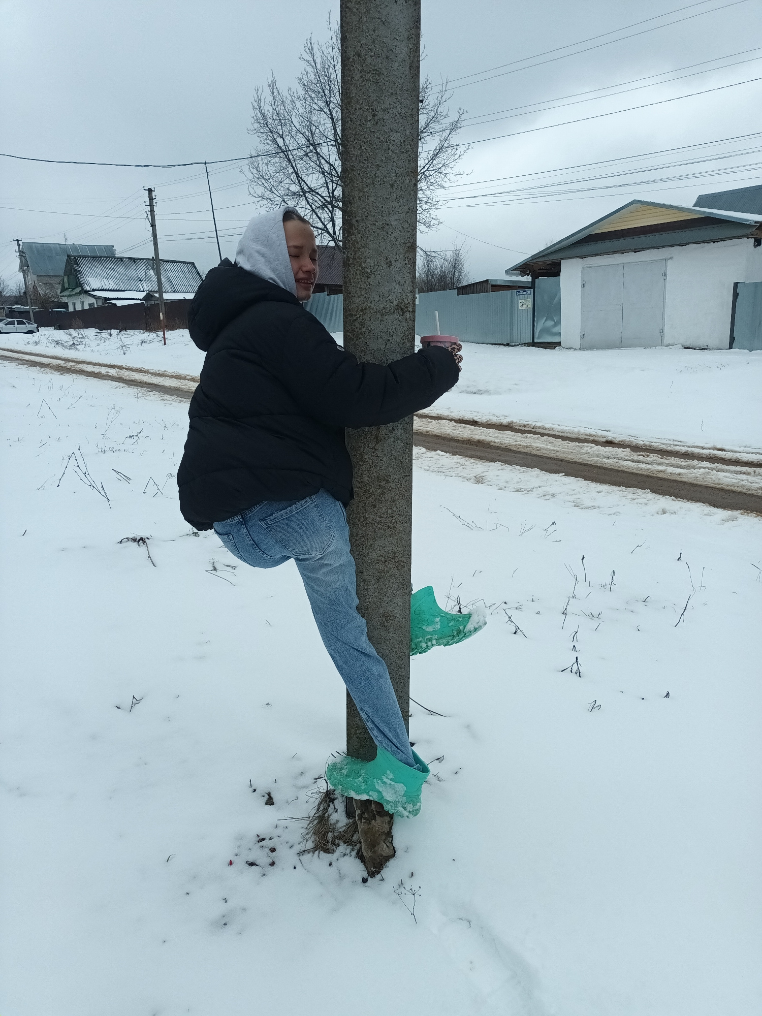 A person wearing a black jacket, light-colored hooded sweatshirt, blue jeans, and green rubber boots is sitting on a gray concrete beam. The person is holding a pink object in their left hand. The bea…read more