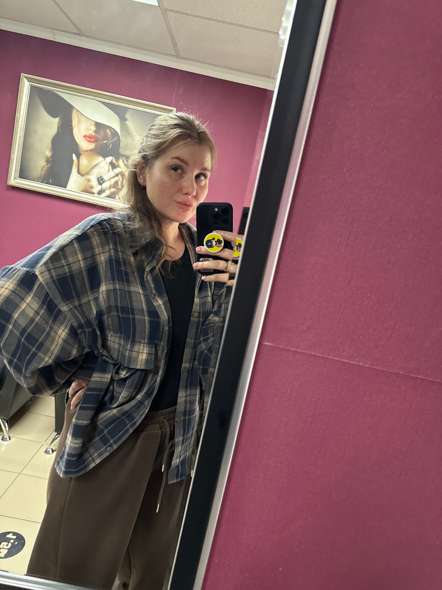 A young woman is taking a selfie in a mirror. She is wearing a plaid shirt over a black top, and brown pants. The mirror is in a room with magenta walls. On one wall is a framed portrait of a woman in…read more