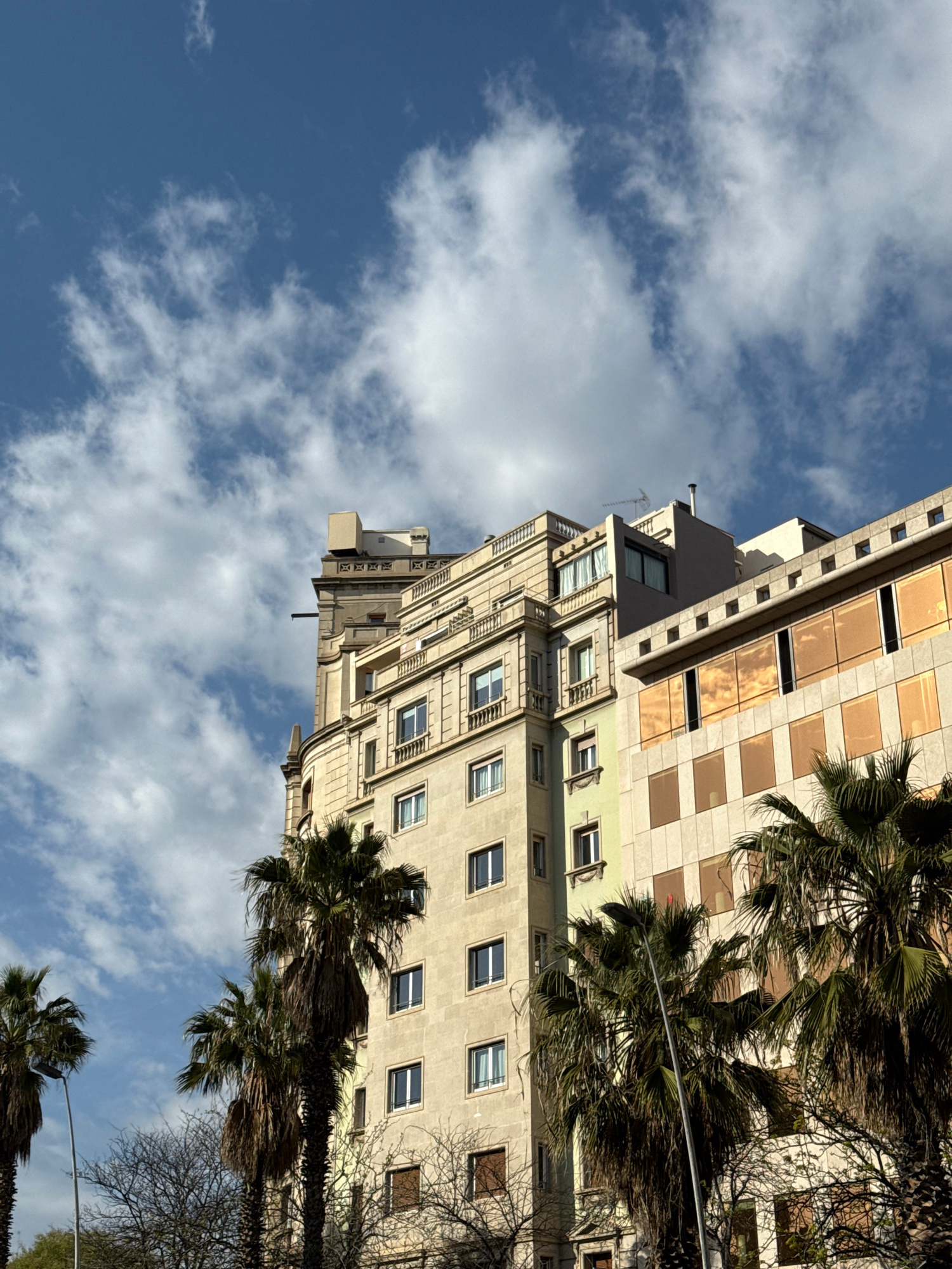 A low-angle shot of buildings and trees against a partly cloudy sky. The building architecture is varied, with the top floor having a checkerboard pattern. Some palm trees are in front of the building…read more