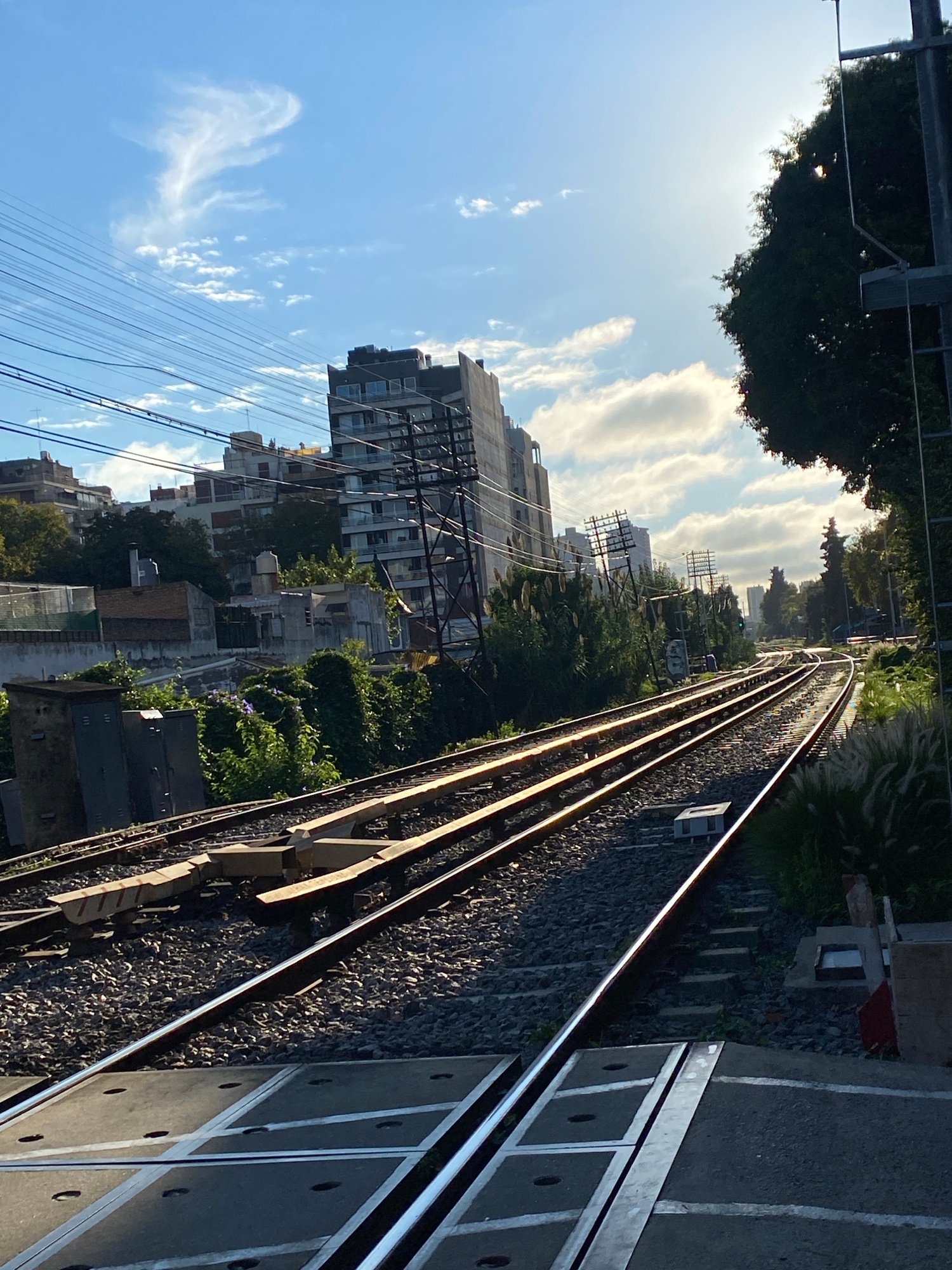 The image depicts a railway track in Buenos Aires, Argentina. The tracks run diagonally through the frame, with the perspective suggesting a view from above. The right side of the frame shows a concreβ¦read more