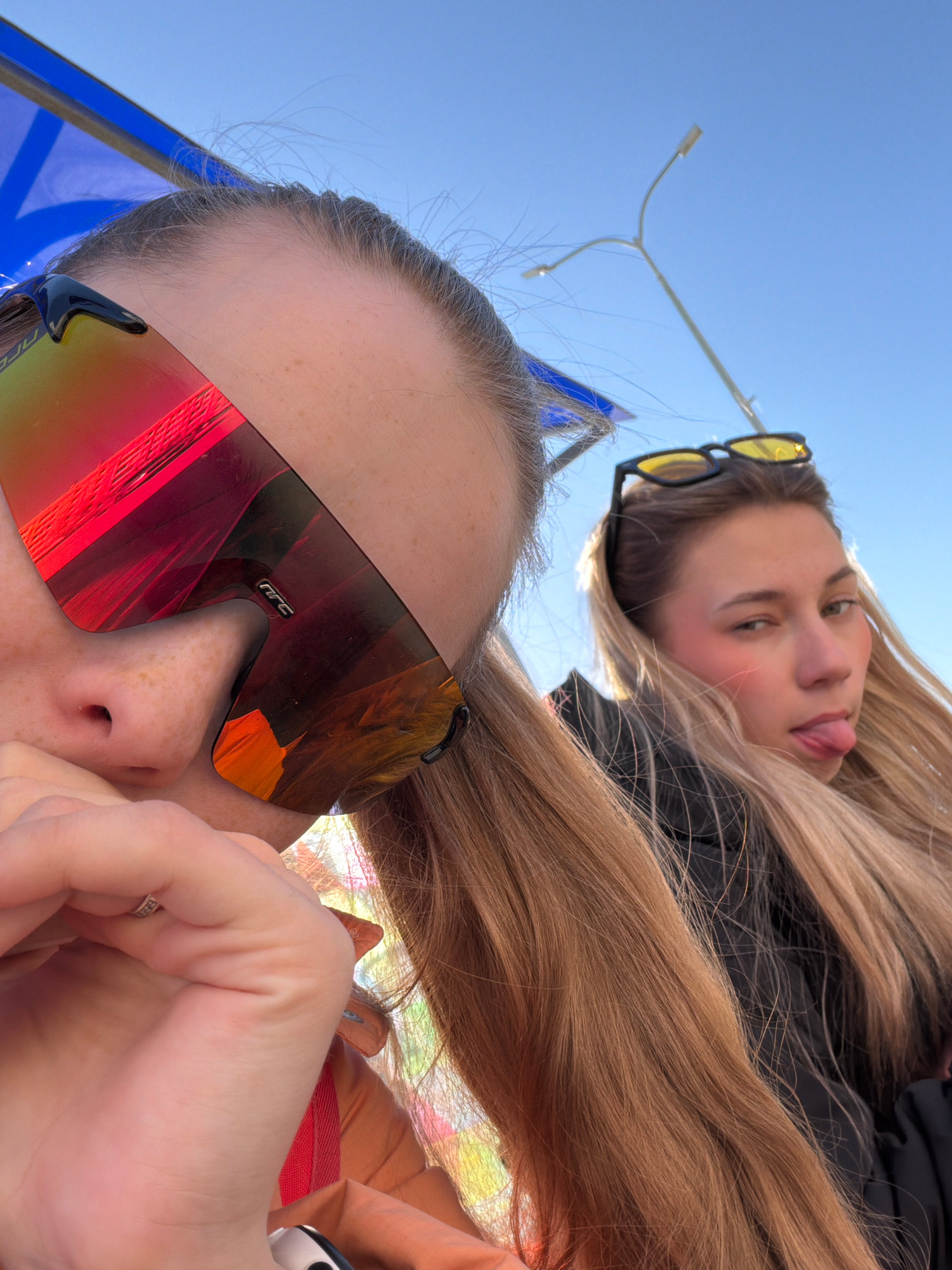 Two young women are depicted in a low-angle selfie against a bright blue sky. The woman in the foreground wears reflective sunglasses, while the woman in the background sticks out her tongue. Long, li…read more