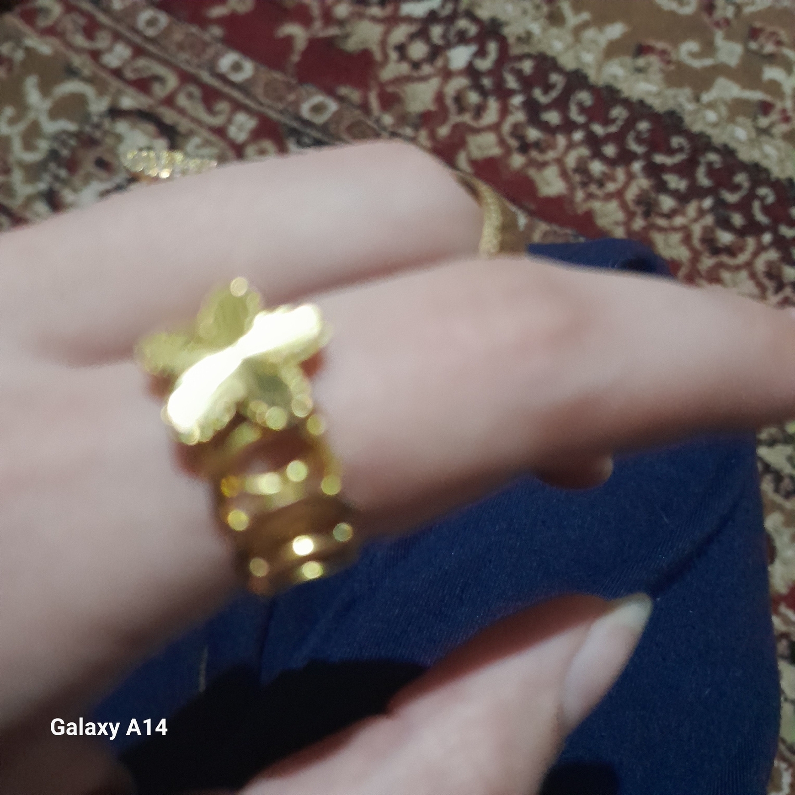 A hand wearing a gold "XOXO" ring rests on a blue surface. The background includes a blurred, patterned surface. The scene has no indication of being located in Khan Yunis, Palestinian Territory.