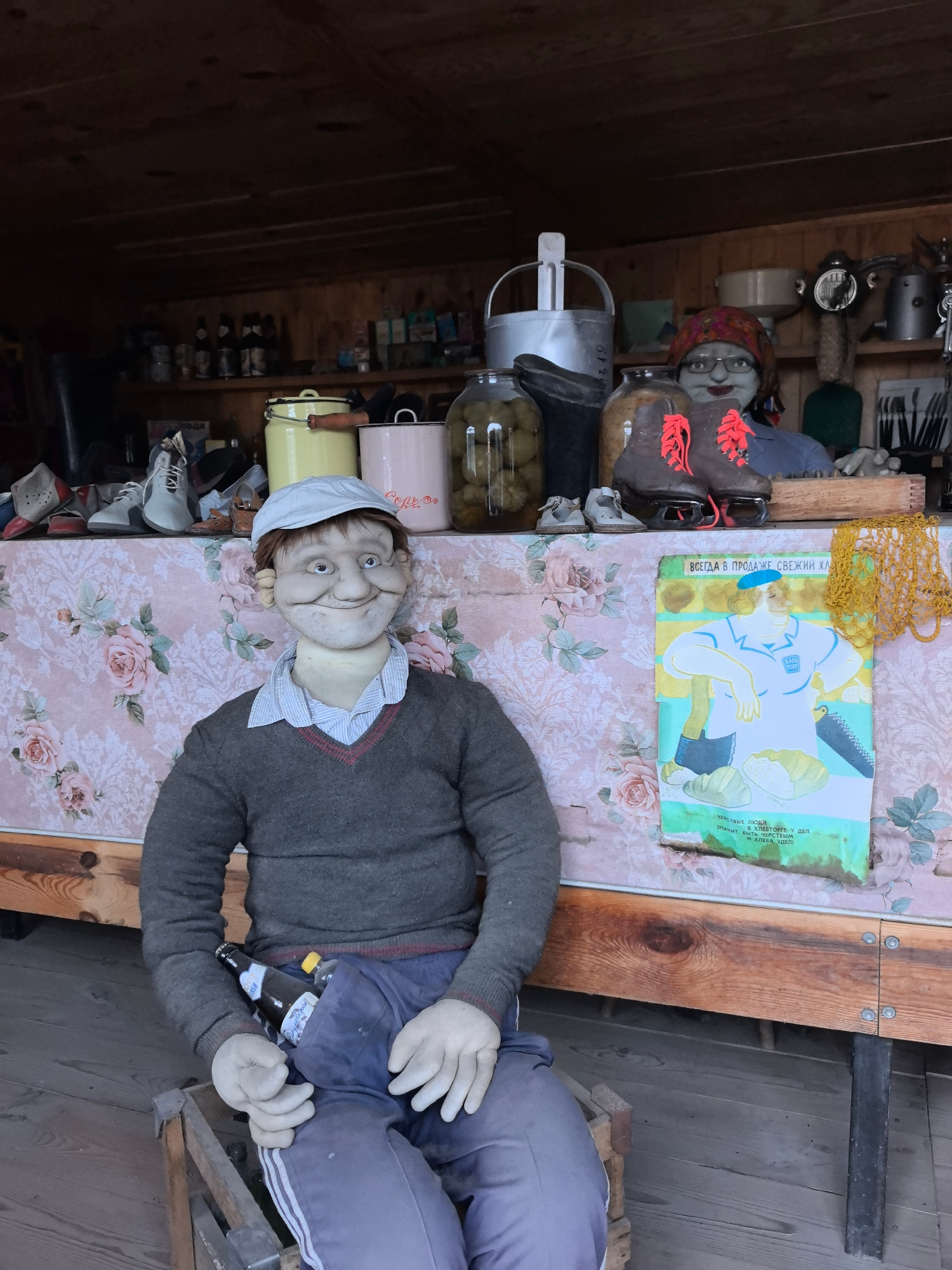A staged display in Bol'shoi Mashlyak, Russia, shows a pale-skinned, male mannequin wearing a newsboy cap, a grey V-neck sweater, a blue button-down shirt, and blue sweatpants with white stripes. He s…read more
