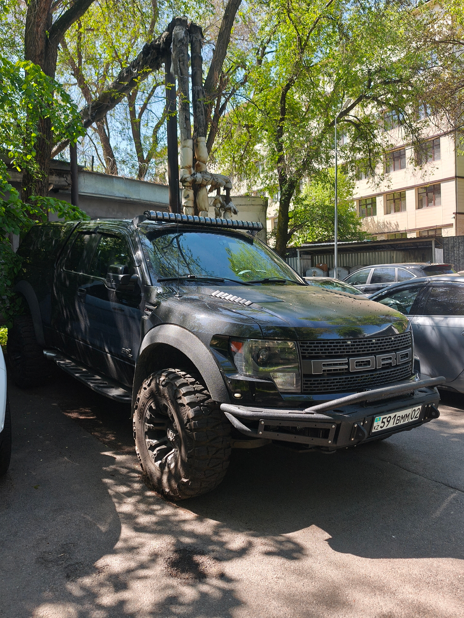 A black Ford Raptor pickup truck is parked on an asphalt surface, likely a parking lot, in an urban setting. The vehicle has oversized tires, a custom front bumper, and a light bar on the roof. The li…read more