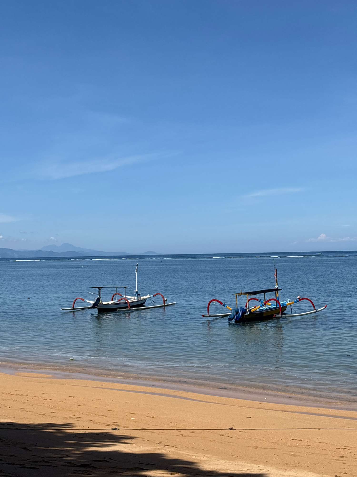 The image shows a coastal scene in Denpasar, Indonesia. Two traditional outrigger boats are anchored near a sandy beach. The water is clear and blue. The sky is clear with some clouds. There is no one…read more
