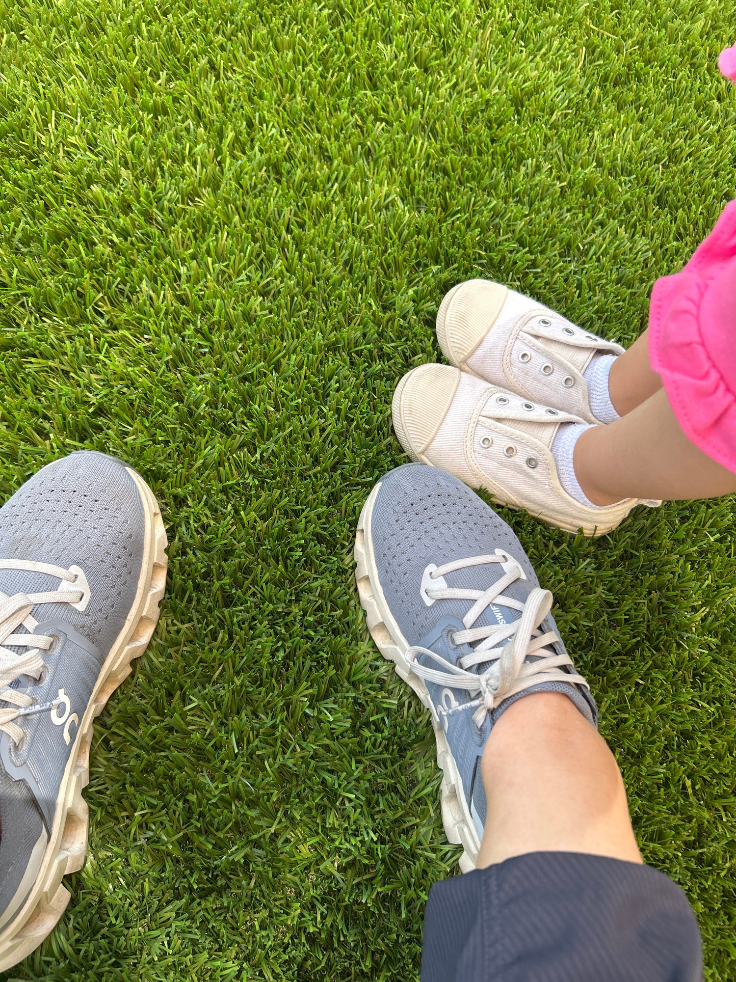 The image shows two pairs of shoes on a green, grassy surface, likely artificial turf. In the upper left corner, a child's feet are visible, wearing white socks and light-colored canvas shoes with no…read more