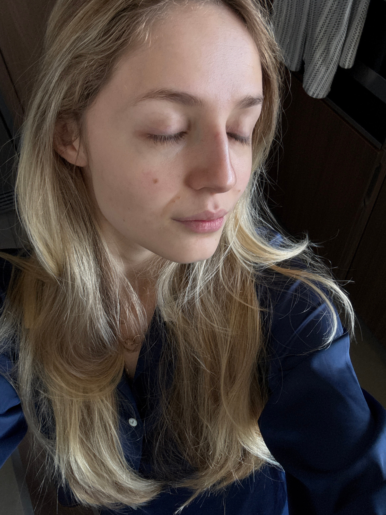 A blonde-haired woman lies with her eyes closed, possibly sleeping. She wears a dark blue garment, perhaps a blouse or jacket. Her head rests on a dark surface. The environment includes what appears t…read more