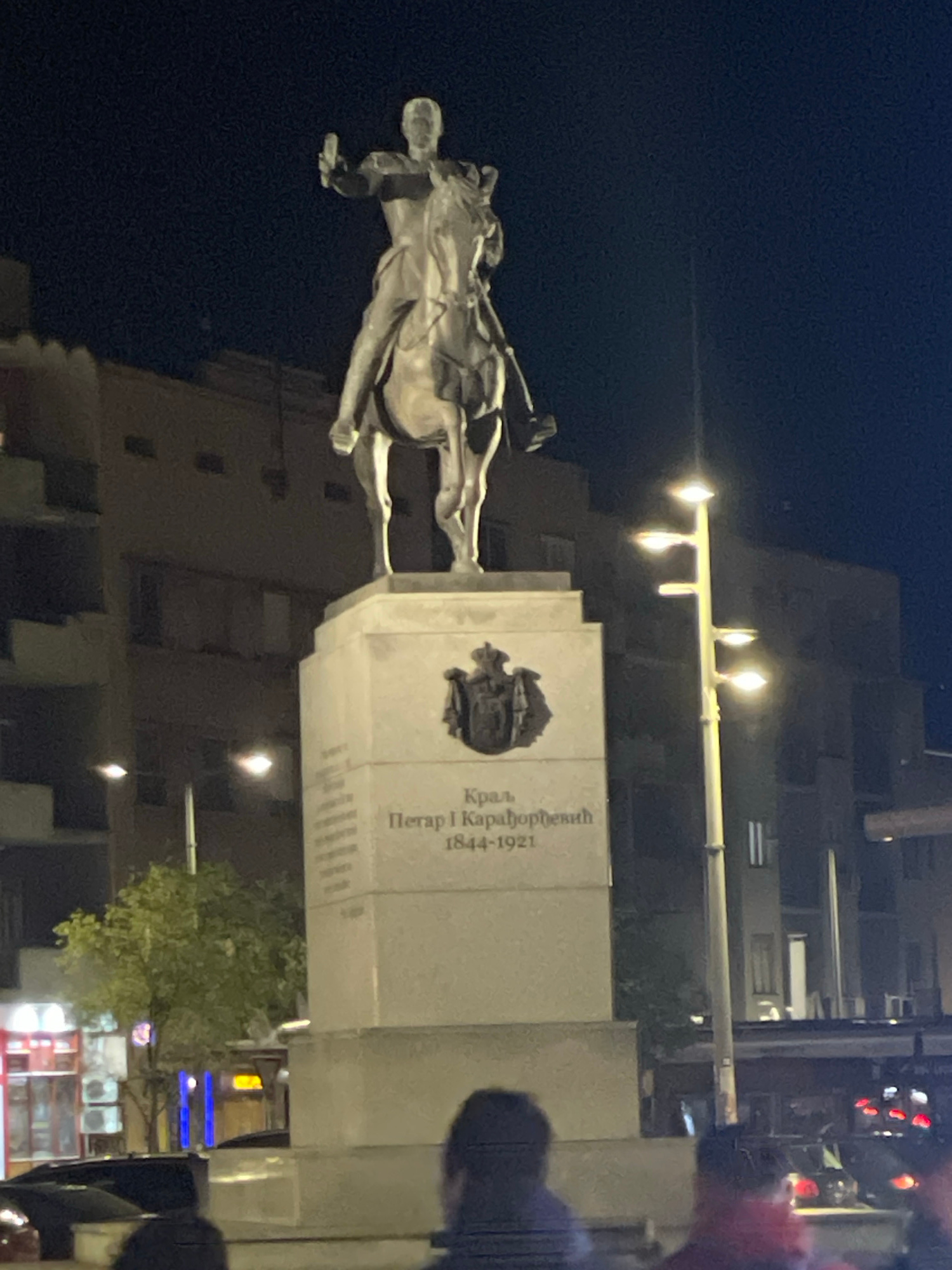 The image depicts the monument to King Peter I Karadjordjevic in Novi Sad, Serbia, at night. A bronze equestrian statue stands atop a white stone pedestal, with the inscription "Краљ Петар I Карађорђе…read more