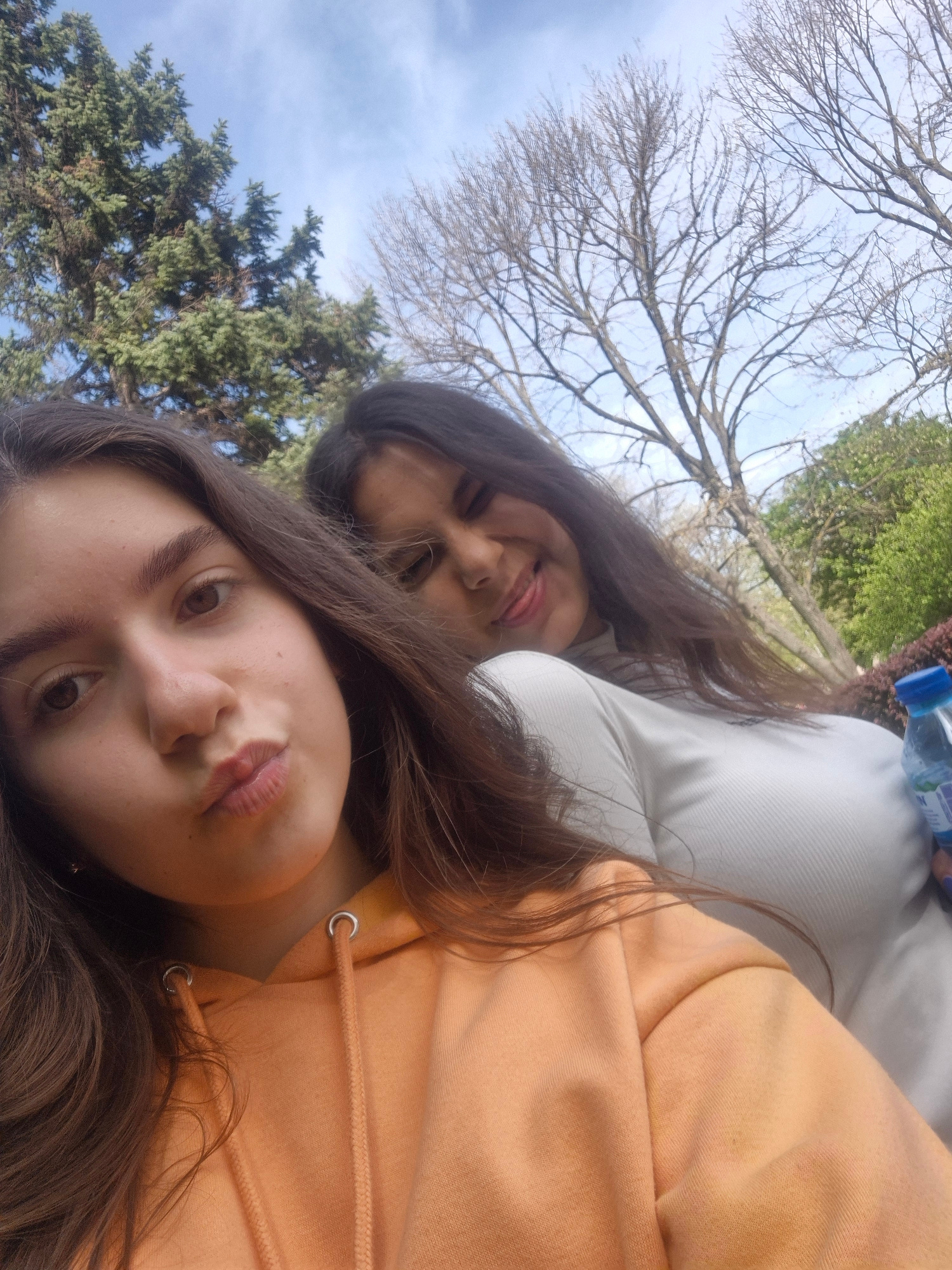 A tilted outdoor selfie features two young women in Pavlikeni, Bulgaria. The woman in the foreground has long, dark brown hair, light brown eyes, and is wearing an orange hooded sweatshirt. She looks…read more