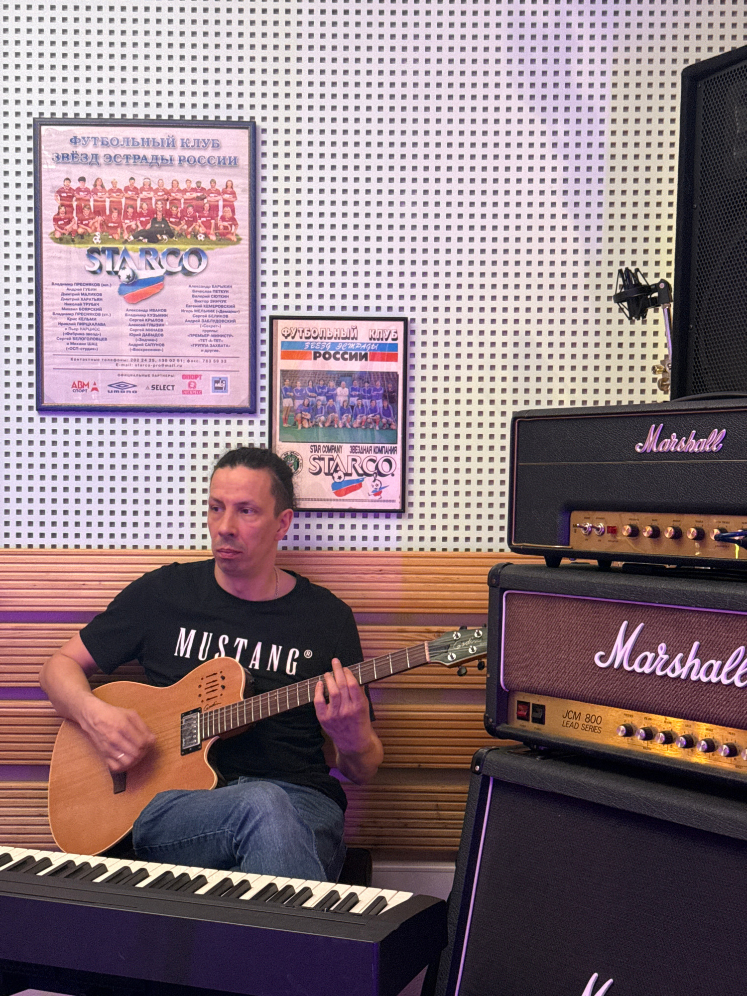 The image shows a man in a black t-shirt with the word "MUSTANG" printed on it, sitting and playing an electric guitar in a room with musical equipment. He is fair-skinned and has dark hair pulled bac…read more