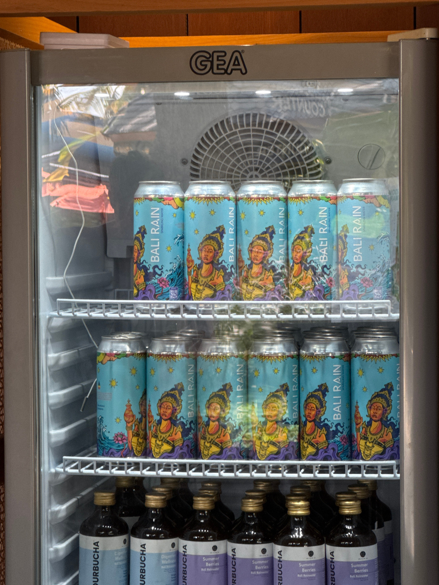 A refrigerator, likely in Kuta, Indonesia, displays stacks of "BALI RAIN SPARKLING WATER" cans and "DURBUCHA Summer Berries" bottles. The refrigerator has a "GEA" logo and a visible cooling fan inside…read more