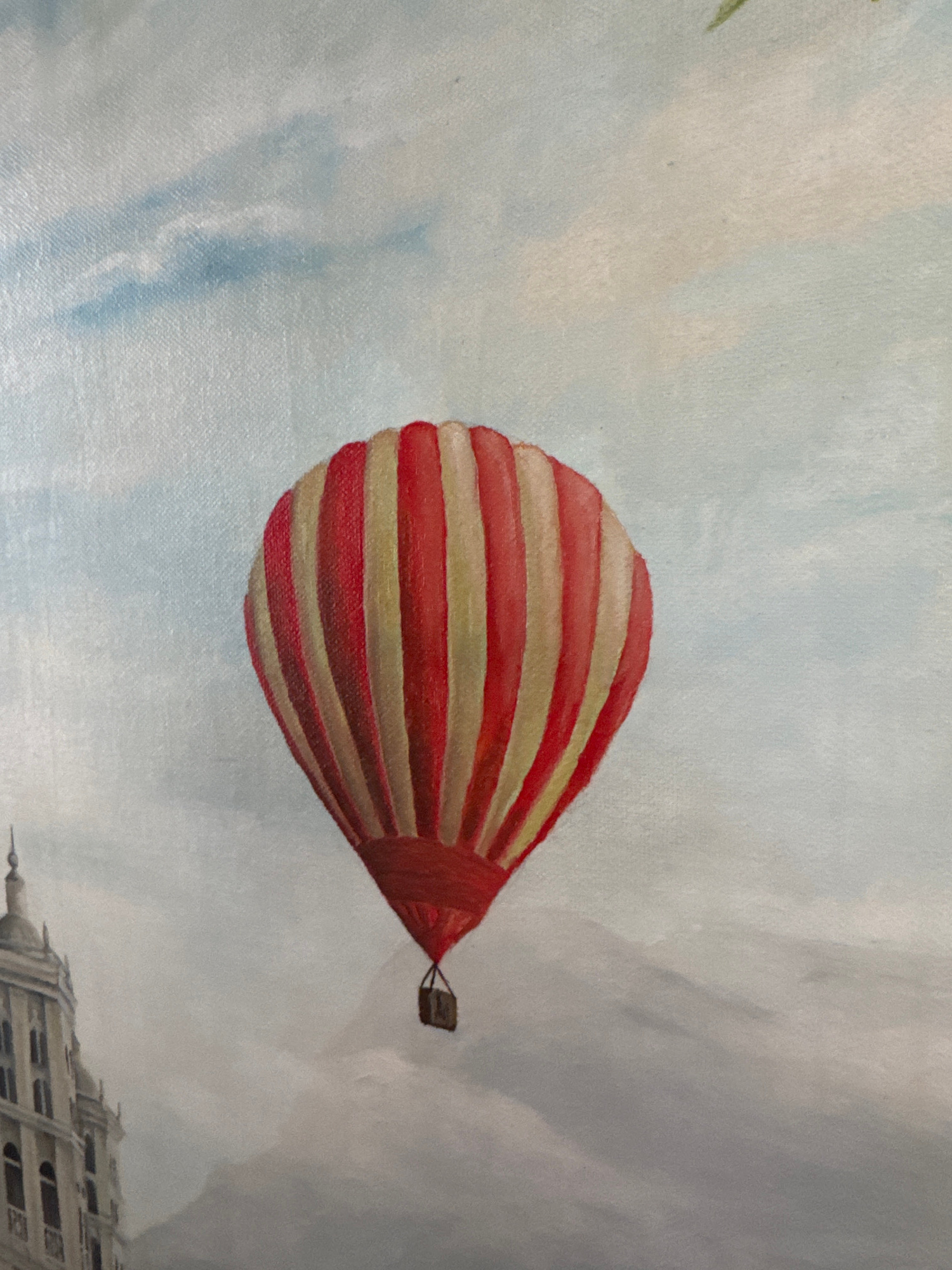 This is a painting depicting a hot air balloon floating in a partly cloudy sky. The main subject is a large, striped hot air balloon, predominantly colored with alternating bands of red and a lighter…read more
