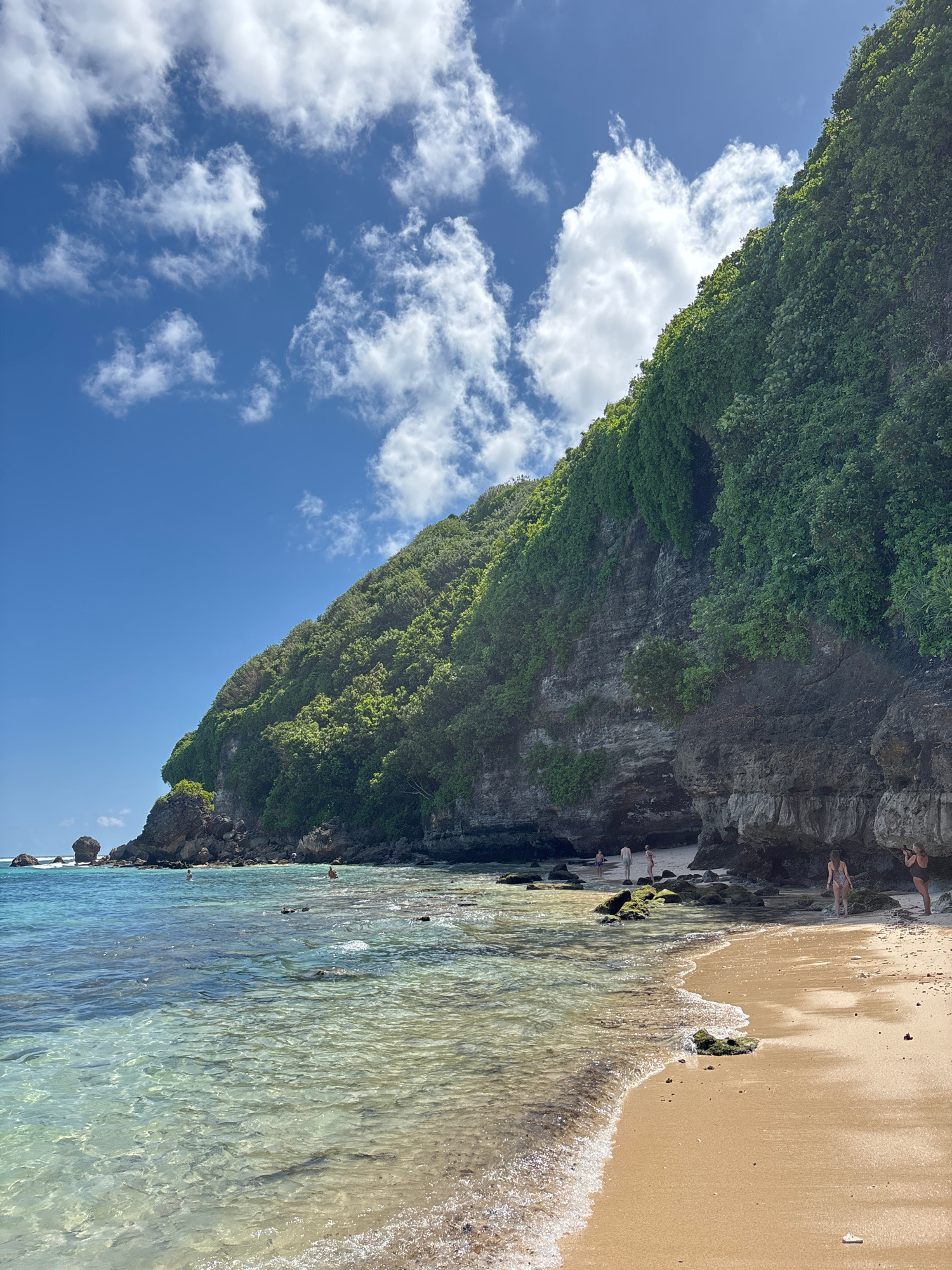 This vibrant photograph captures a scenic tropical beach in Kuta Selatan, Indonesia, under a bright, sunny sky with scattered white clouds. A dramatic, towering cliff face, densely covered in lush gre…read more