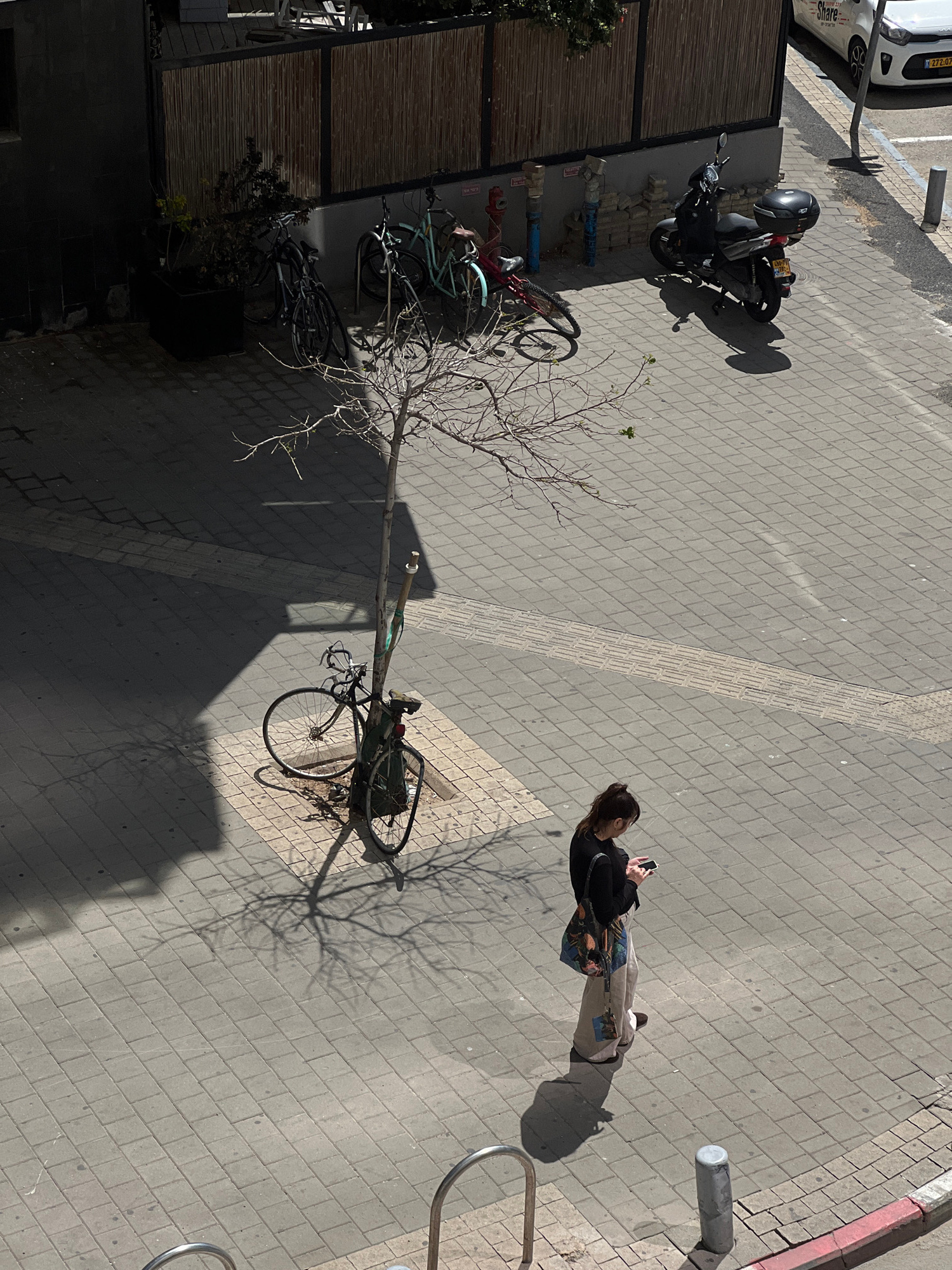 The image shows an overhead view of a street scene in Tel Aviv, Israel. A woman stands on a tiled sidewalk, looking at her phone. She is wearing a dark top, light-colored pants, and carrying a patter…read more