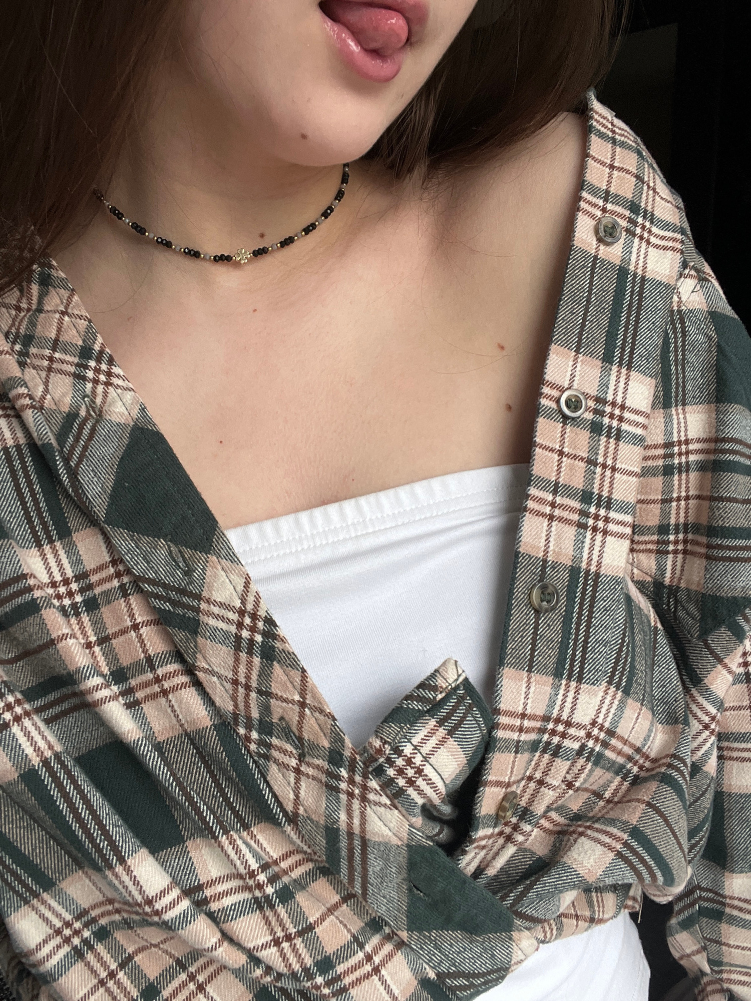 A close-up, angled shot captures the upper torso, neck, and part of the face of a person, who appears to be reclining. The person is wearing a cozy plaid flannel shirt featuring a pattern of dark gree…read more