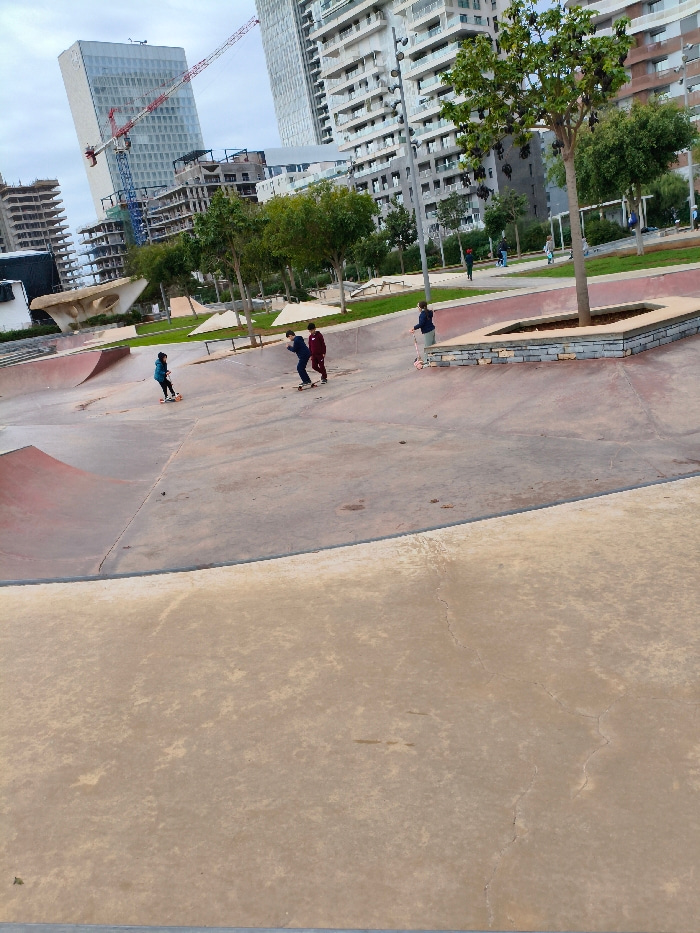 A skatepark with several people is visible, featuring concrete bowls and ramps. Two boys skateboard near the center while a girl rides a scooter. A tree is planted inside a raised brick structure. The…read more