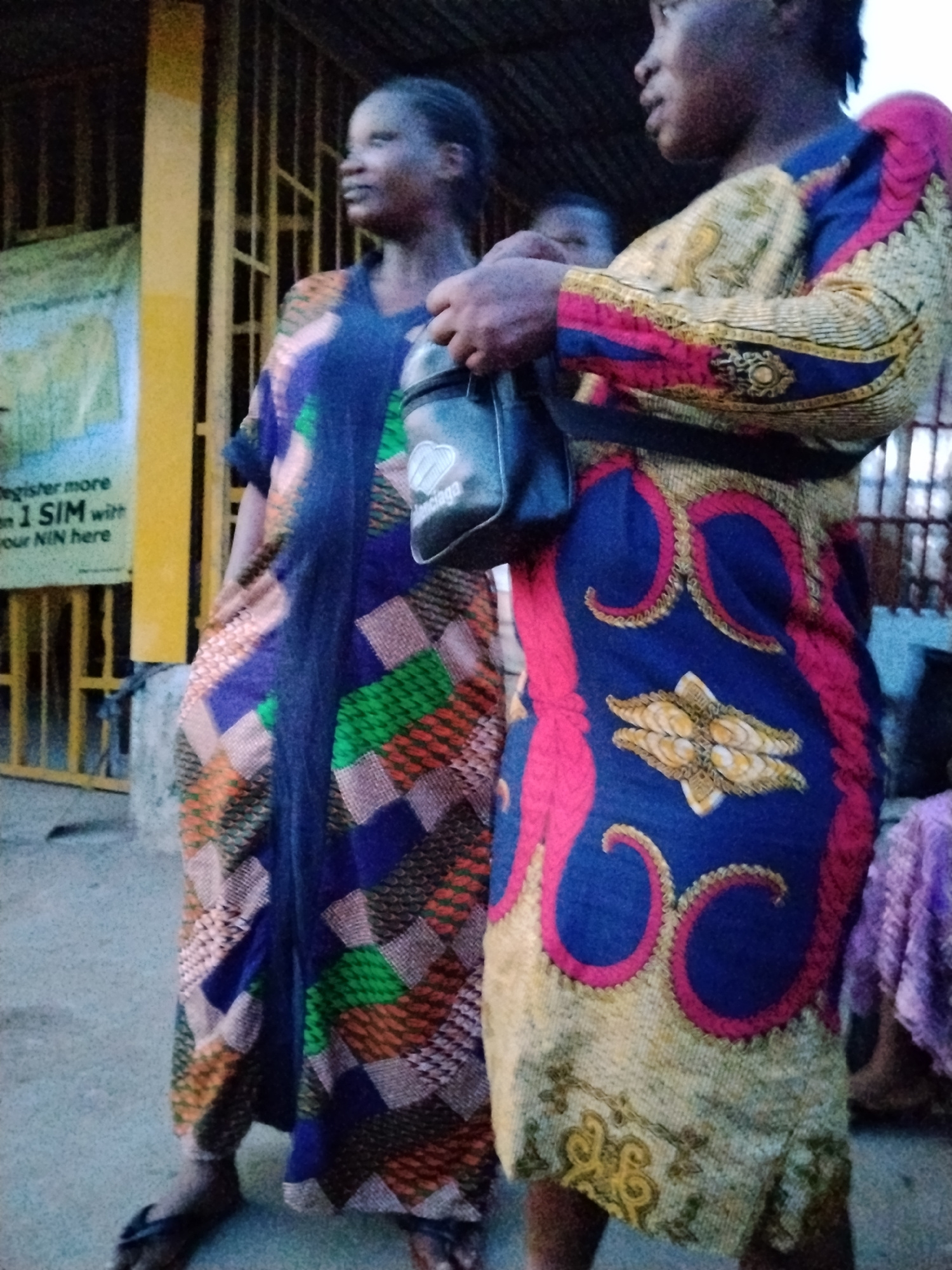 In Ura Nta Umuarandu, Nigeria, two women stand close to each other on what appears to be a street. The woman on the left is wearing a floor-length gown patterned with blue, green, and orange geometric…read more