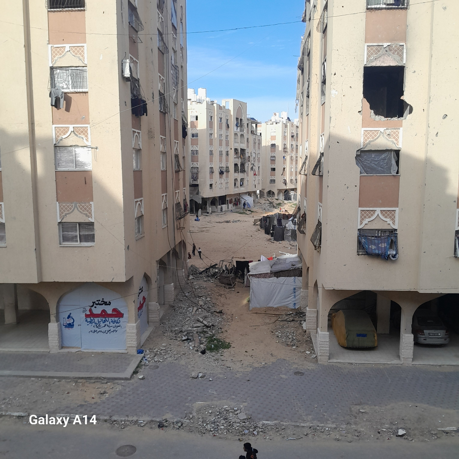 An aerial view captures an urban landscape in Khan Yunis, Palestinian Territory, characterized by multi-story residential buildings flanking a central open area. The sky above is clear blue. The buil…read more