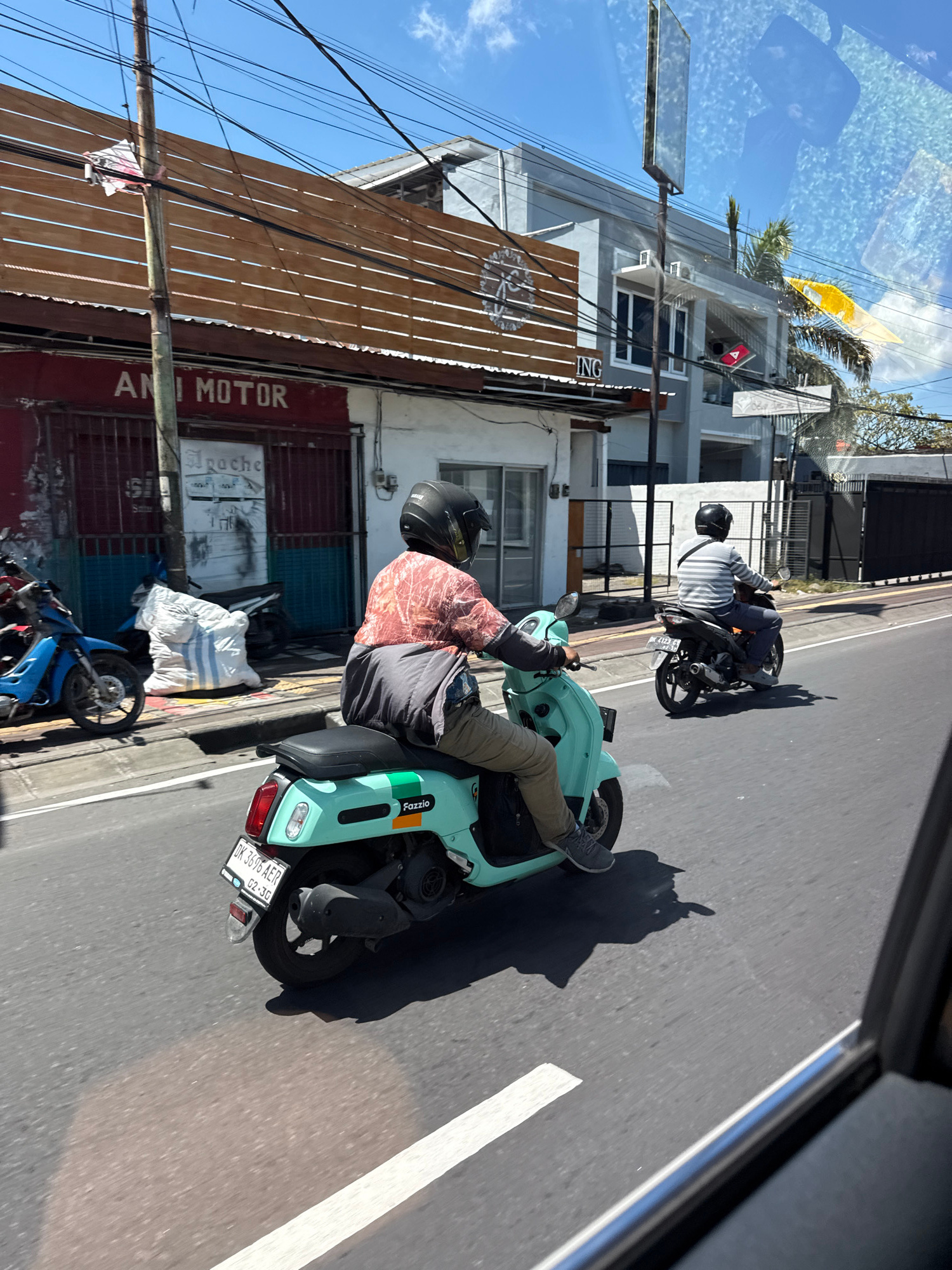 The image captures a vibrant street scene under bright daylight, seemingly taken from inside a moving vehicle due to reflections visible in the upper frame. Two individuals are riding motorbikes on an…read more