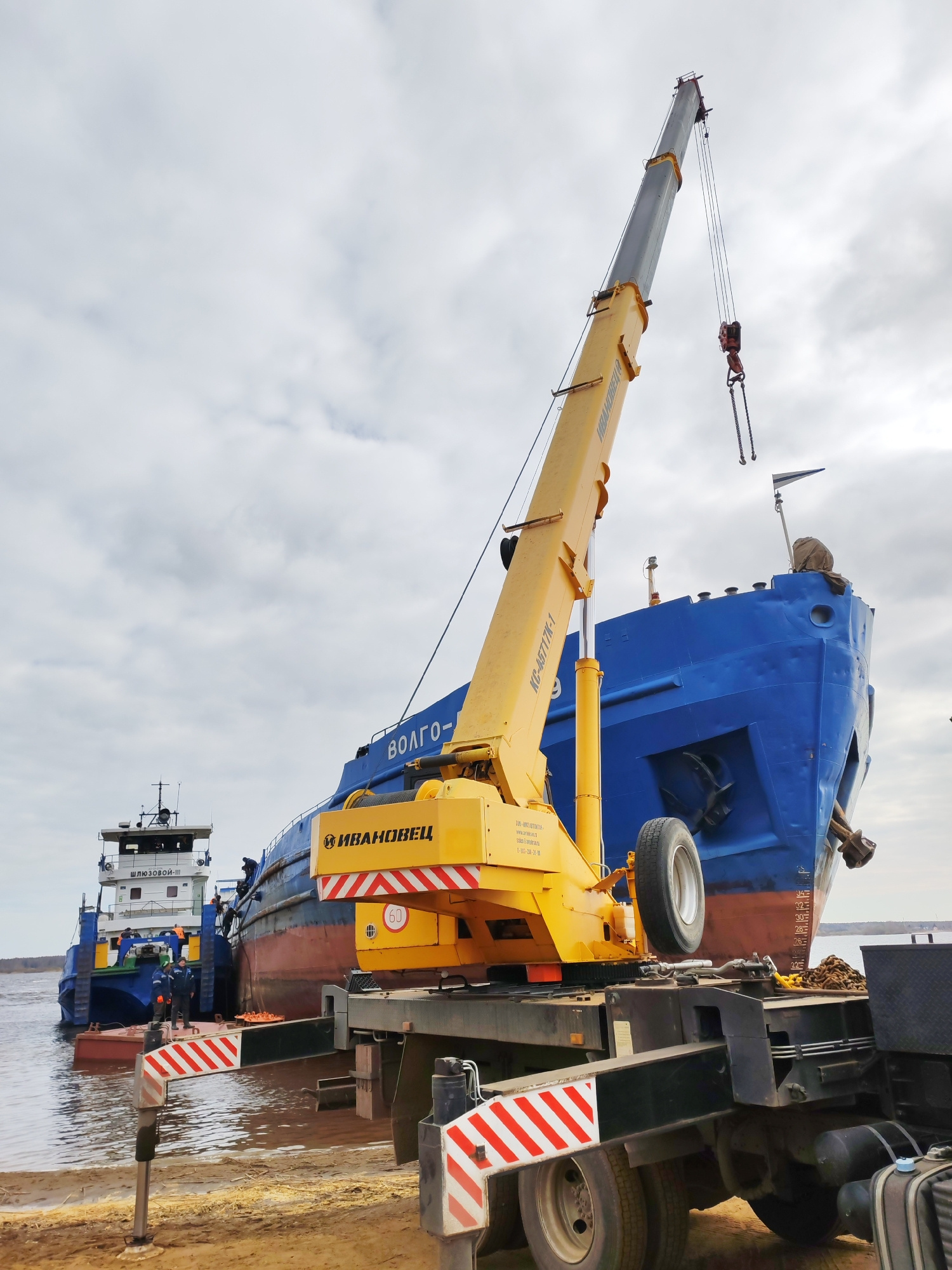 A yellow and black crane, operated by the company "Ivanovets," extends its boom towards a large, blue vessel named "Volgo-" on the shores of a body of water in Rybinsk, Russia. A smaller, white and bl…read more