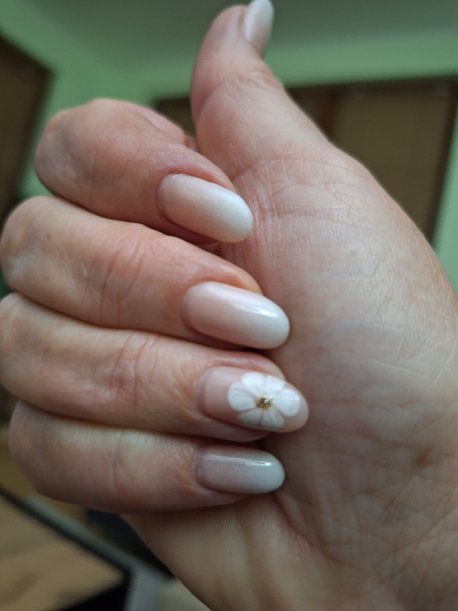 A close-up shot shows a person's hand with manicured nails. The nails are painted in a pale pink/nude color, except for the ring finger, which has a white flower design on it. A small gold embellishme…read more