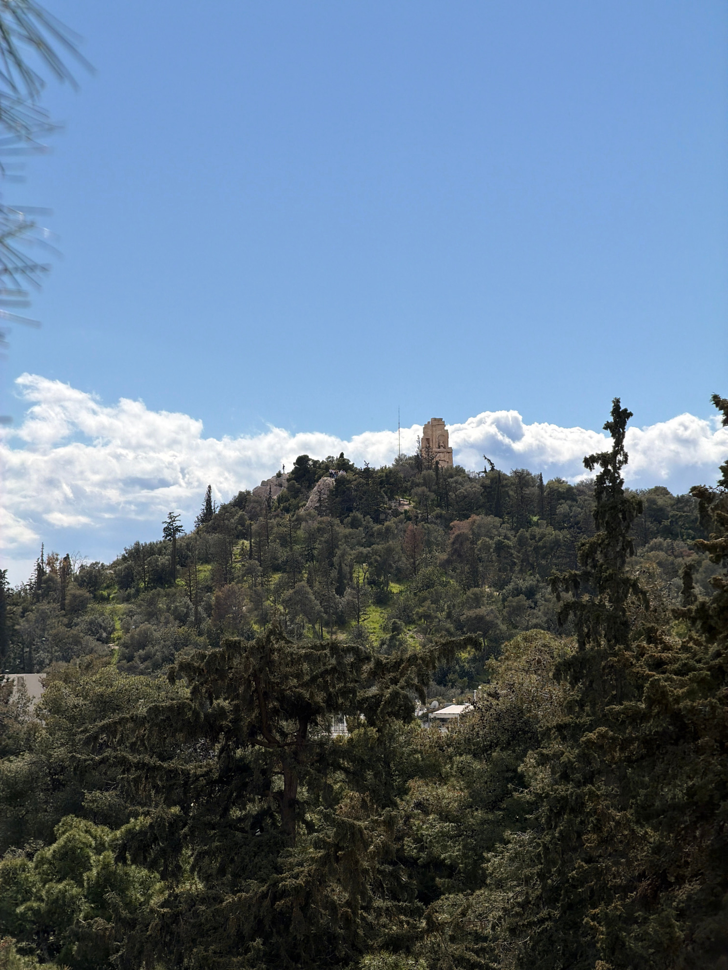 The image shows a landscape in Athens, Greece, featuring the Acropolis Hill with the Philopappos Monument at its peak, partially obscured by trees. The sky is light blue with scattered white clouds. T…read more