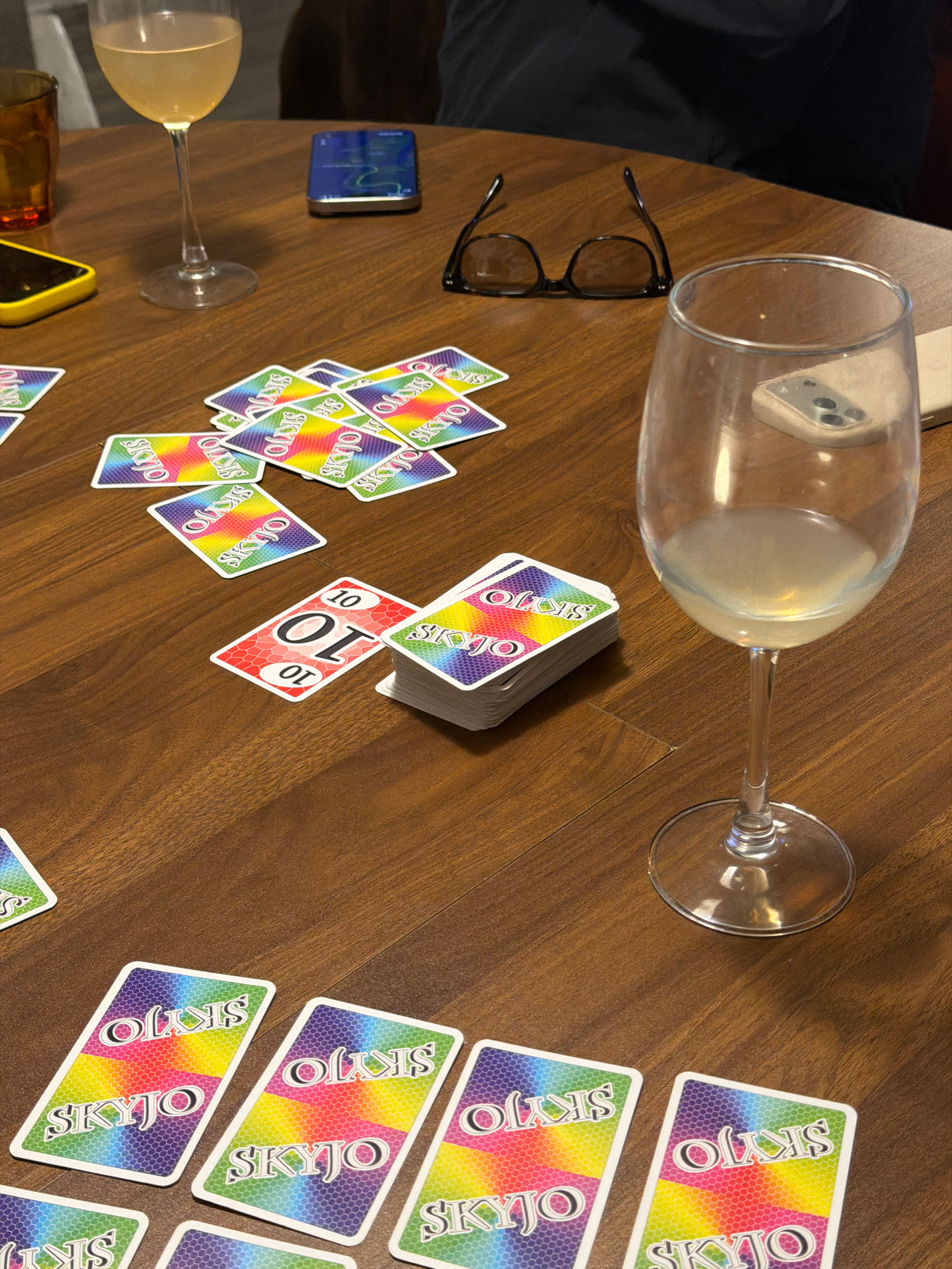 On a brown wooden table, a game of SKYJO is in progress, with scattered SKYJO cards. A large glass of white liquid sits near a pair of black-rimmed glasses and a small blue electronic device. To the l…read more