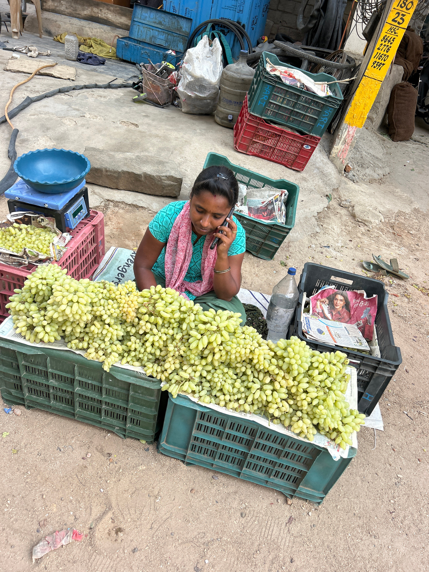 The image depicts a street scene in Puttaparthi, India. An Indian woman is seated on the ground, speaking on a cell phone, while surrounded by crates of green grapes that appear to be for sale. There…read more