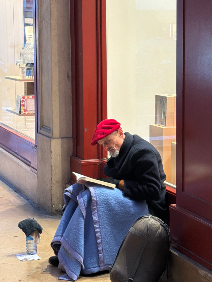 An elderly man in a red beret sits on a blue blanket, leaning against a building next to a shop window, possibly reading. He has a black jacket and a rolled-up sleeping bag next to him. A makeshift do…read more