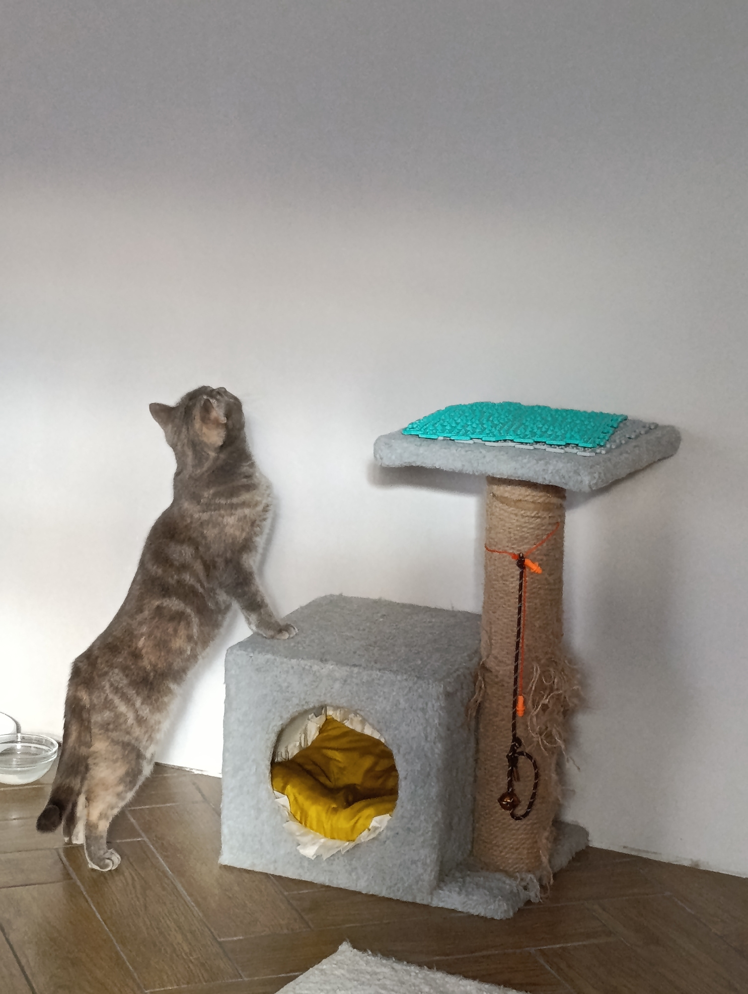 A grey and brown tabby cat stands on its hind legs, with its front paws resting on the lower level of a cat tree. The cat is looking upwards and slightly to the right, appearing focused or playful. T…read more
