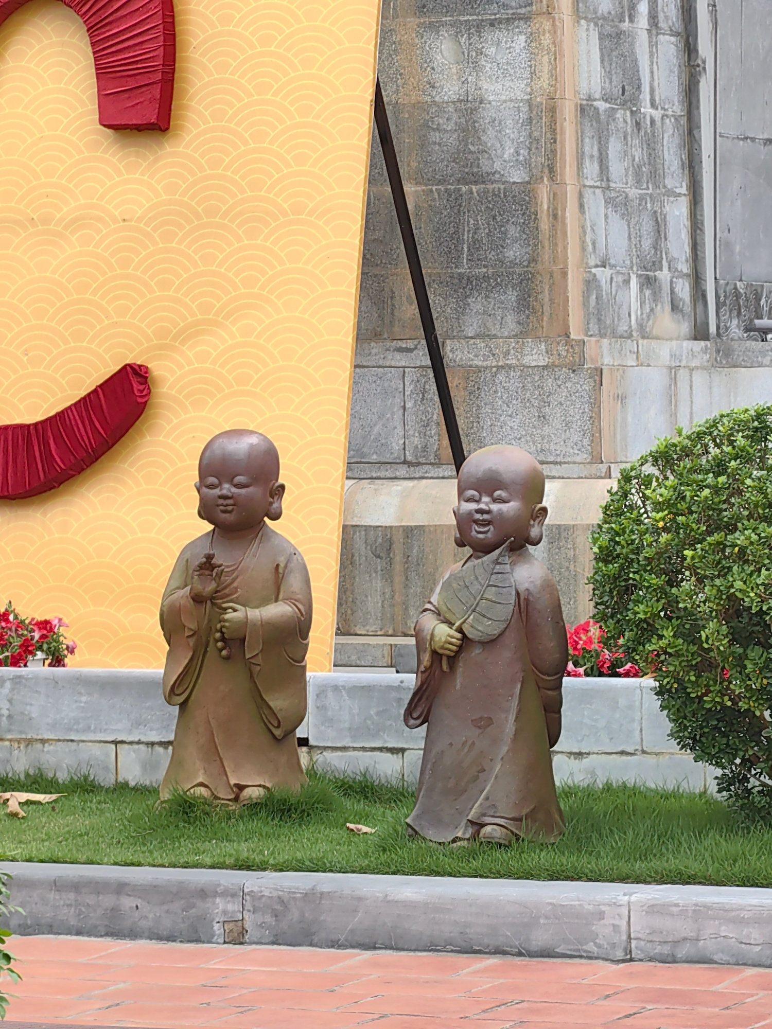 Two charming statues of young monks stand side-by-side on a patch of green grass in an outdoor setting, likely a garden or courtyard in Hong Gai Ward, Vietnam. The monk statue on the left faces forwa…read more