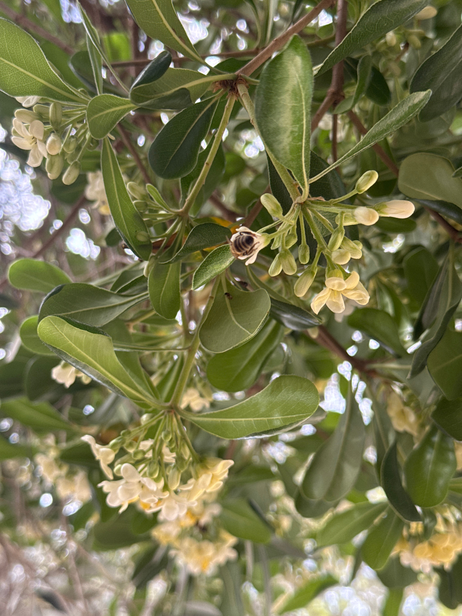 The image shows a cluster of pale yellow flowers and green leaves, likely from a Pittosporum tobira (Japanese Pittosporum). A bee is visible on one of the flowers. The setting is outdoors and based on…read more