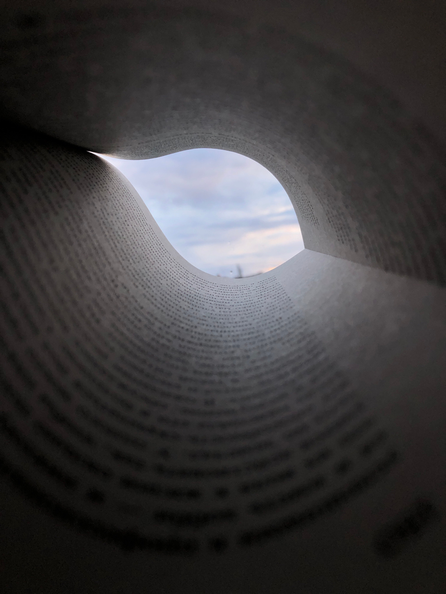 The image presents an abstract, close-up view from inside a book, looking outwards through an opening formed by its curved pages. The light-colored pages are bent and scrolled, creating a tunnel-like…read more