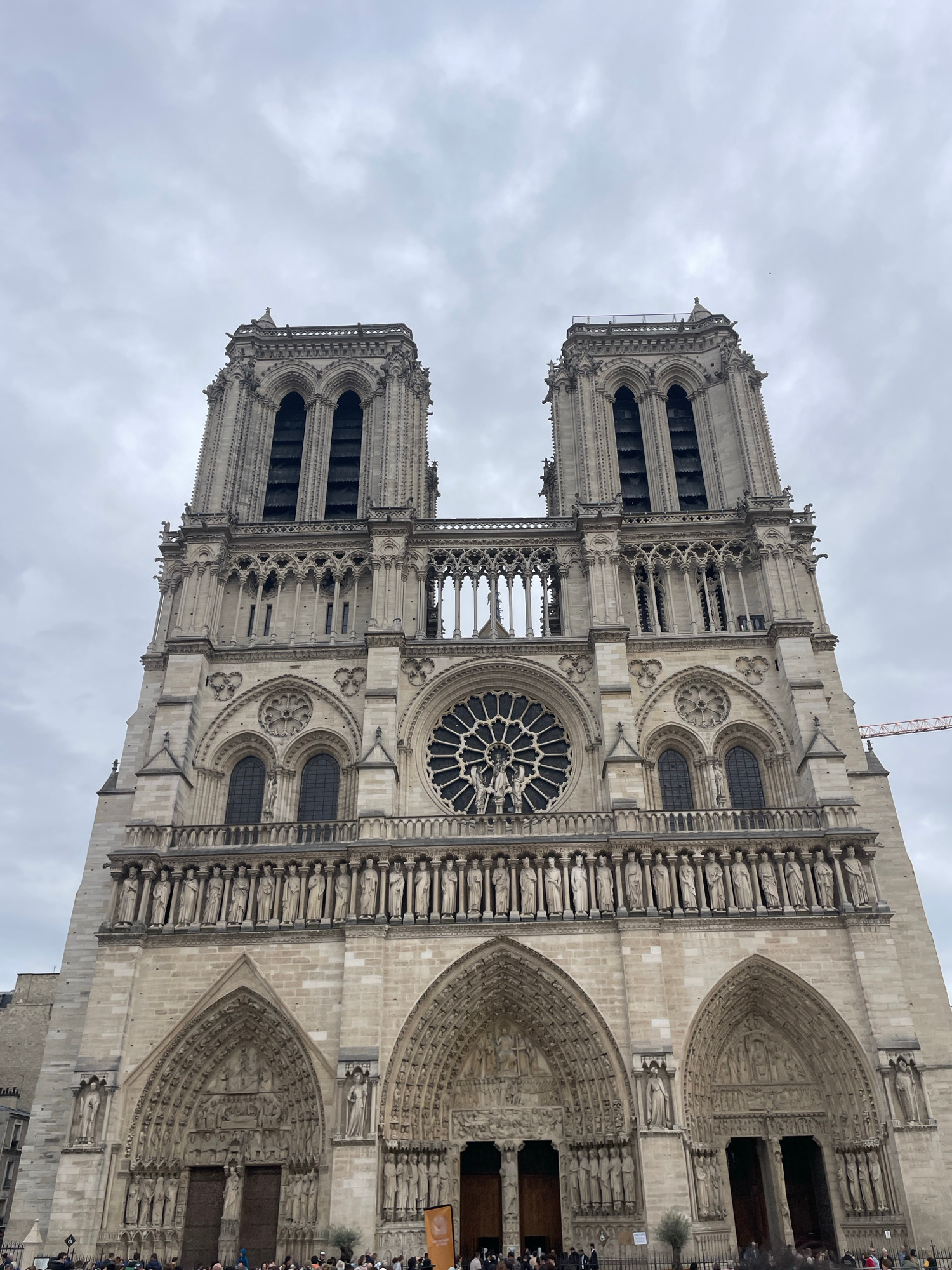 The image shows a low-angle view of the Notre Dame Cathedral in Paris, France. The facade is made of light-colored stone, with two towers visible on the left. A large rose window is centered on the fa…read more