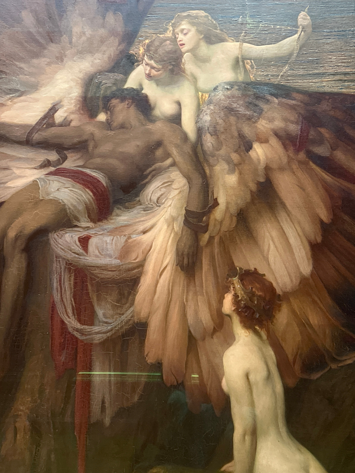 The painting depicts a dramatic and poignant mythological scene centered around the lifeless body of Icarus, mourned by sea nymphs. **Subjects:** The central subject is the pale, deceased body of Ica…read more