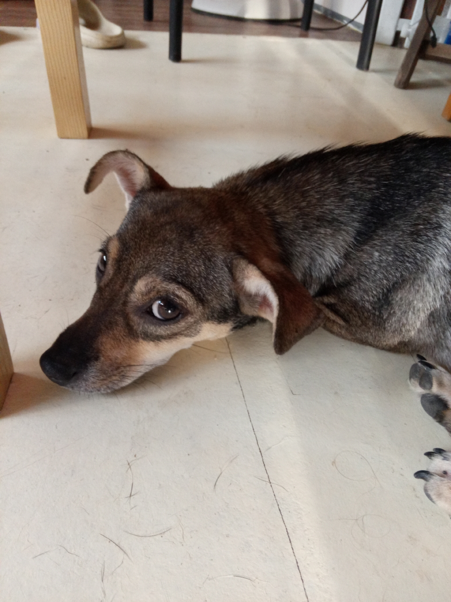 A dog with brown and gray fur is lying on a light-colored floor. The dog's head is turned towards the camera, and its ears are visible. The dog's paws are also visible in the lower right corner of the…read more