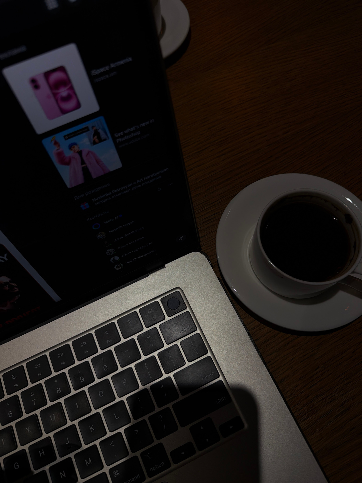 The image shows a dark scene with a laptop, a cup of coffee on a saucer, and a mobile phone. The laptop is open, revealing part of its keyboard. The phone screen shows a social media feed in Armenian,…read more