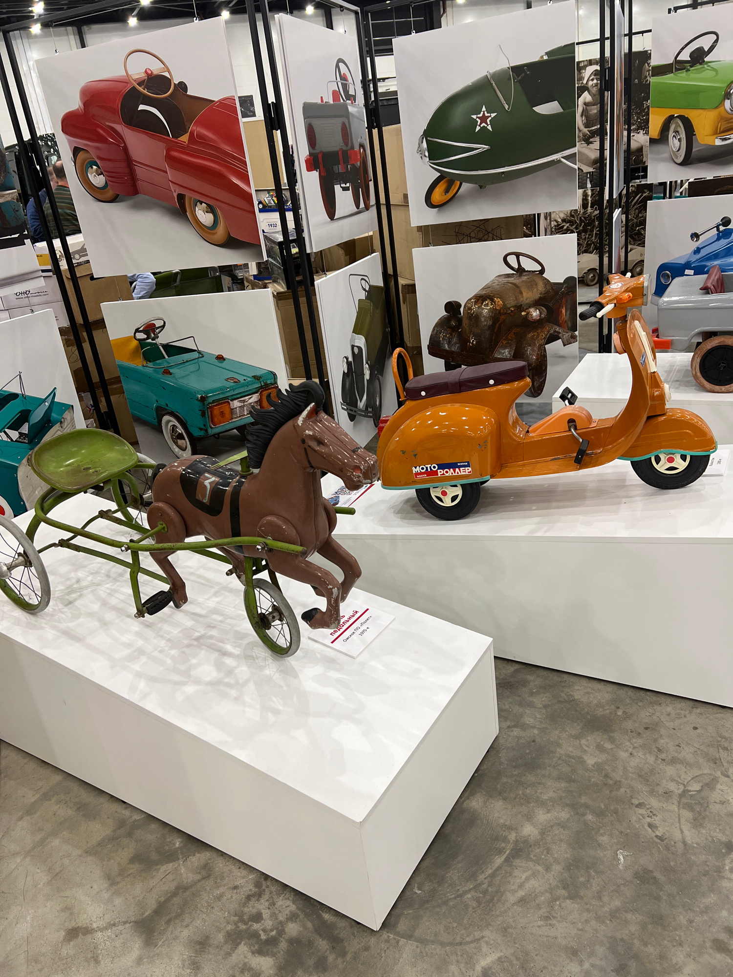 The image shows a display of vintage toy vehicles and photographic prints in an indoor exhibition setting, possibly in the city of Unknown, Unknown. The display includes a child's orange scooter with…read more