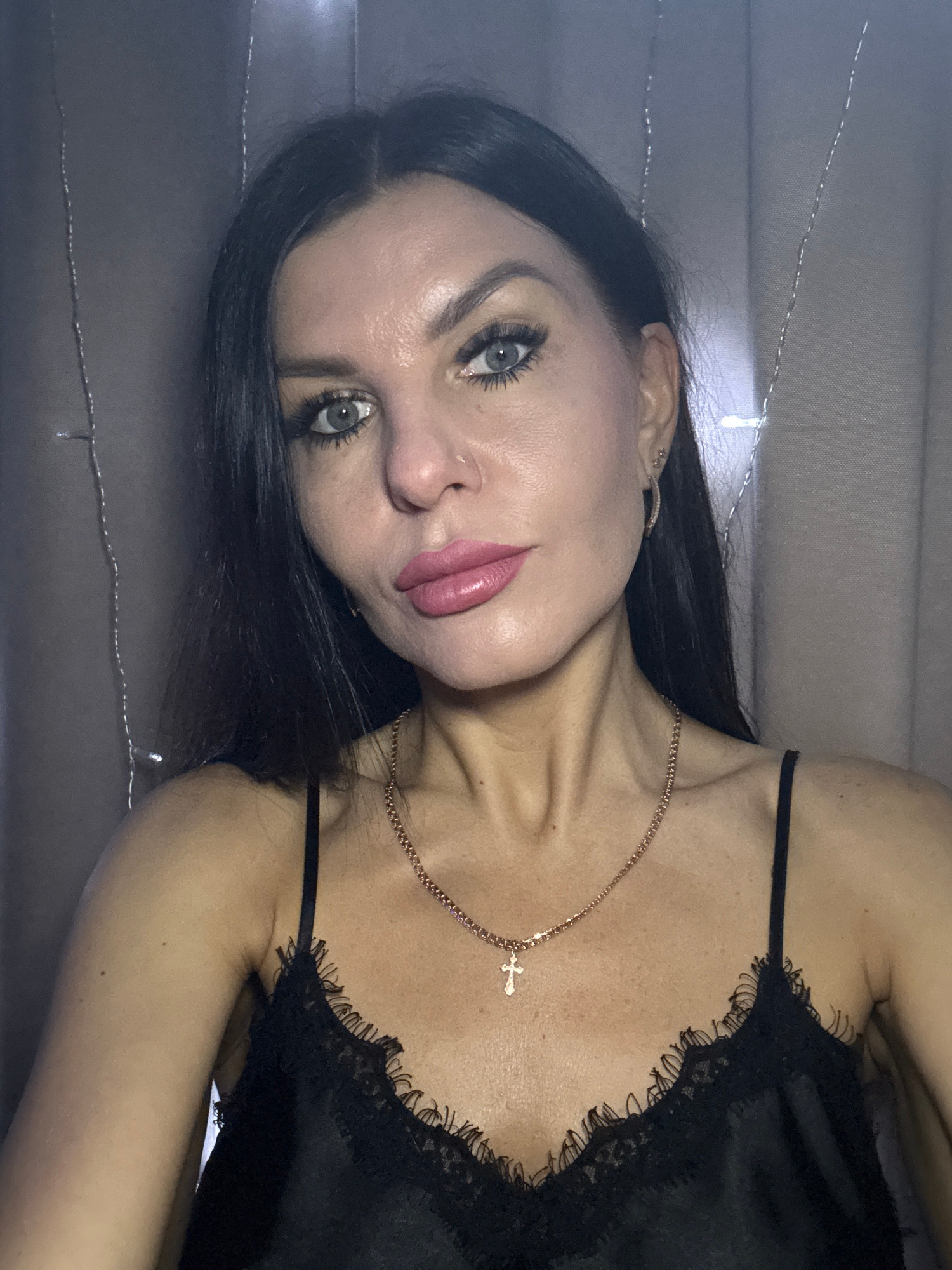 A woman with dark hair is lying on a gray surface. She is wearing a black top with lace trim and a gold necklace with a cross pendant. She has light-colored eyes and pink lipstick. There are small strβ¦read more