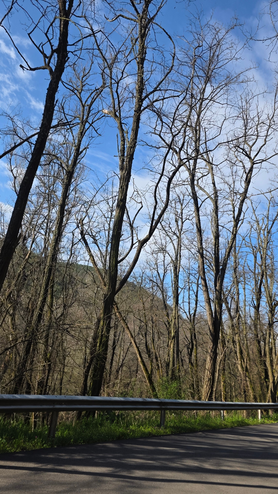 The image depicts a scene alongside a road, likely in a rural or semi-rural area of Blagoevgrad, Bulgaria. Leafless trees dominate the left side of the frame, their branches reaching into a blue sky w…read more