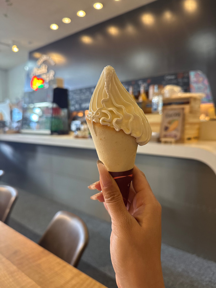 A hand delicately holds a white ice cream cone with a decorative swirl of soft serve on top. The cone has a burgundy paper wrap. The background shows a blurred cafe interior, with lighting fixtures an…read more