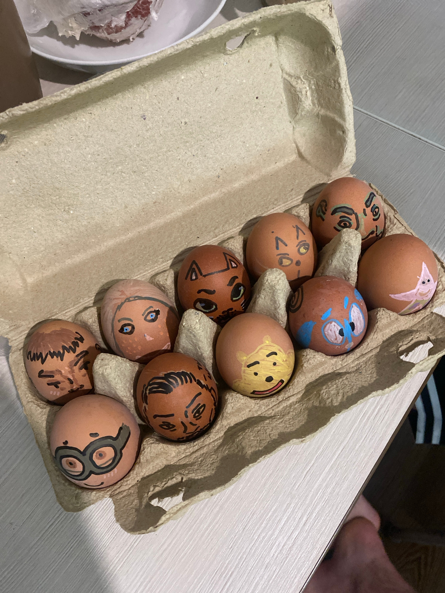 A top-down shot shows eleven brown eggs with hand-drawn faces in a tan cardboard egg carton. The eggs are arranged in the egg carton, partially filling the available slots. The egg carton sits on a li…read more