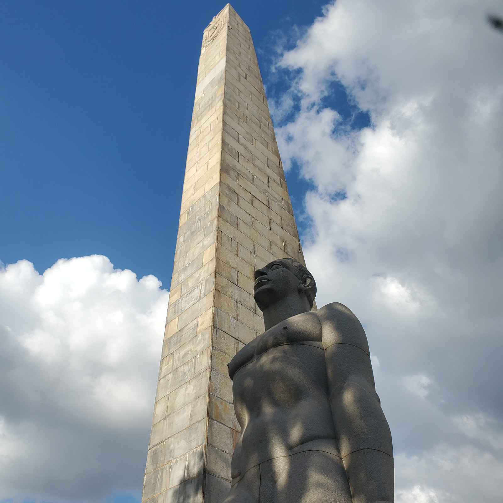 A low-angle outdoor shot in Curitiba, Brazil, captures two prominent stone monuments against a bright blue sky filled with scattered white clouds. The image is oriented vertically, looking upwards. O…read more