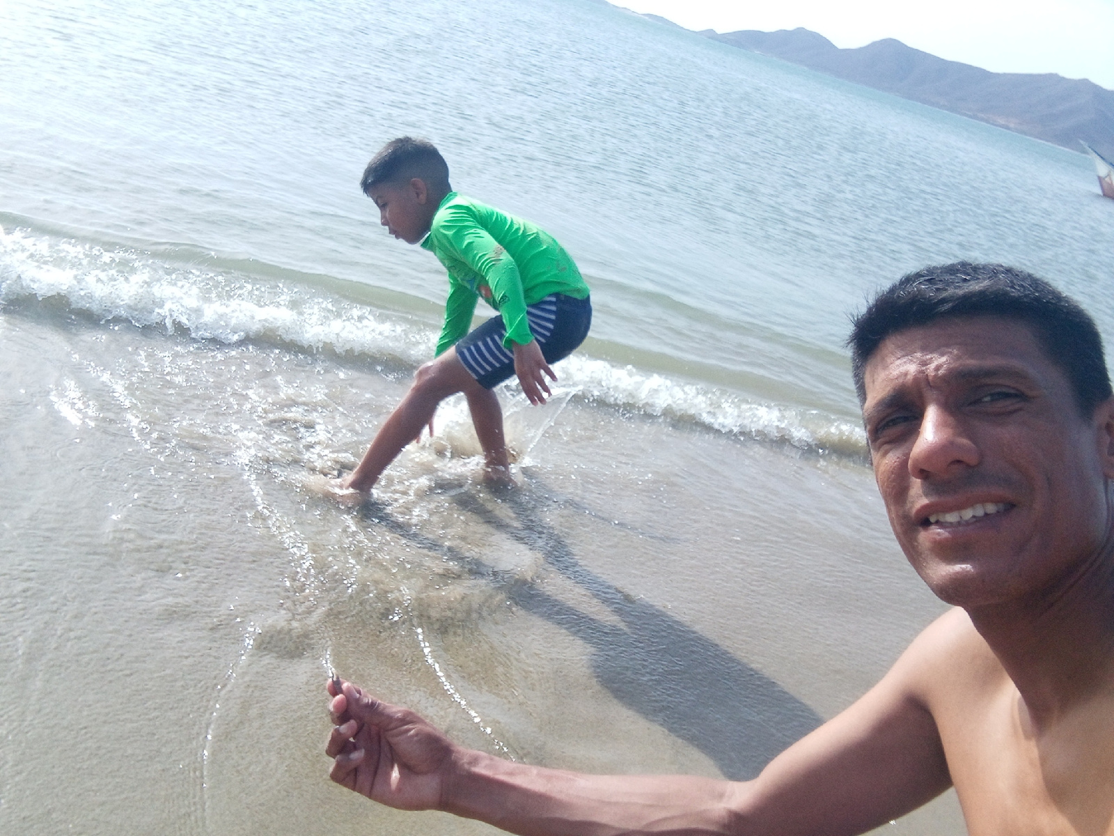 A medium shot taken at what appears to be Playa La Galera, Juan Griego, Venezuela, shows an adult man with a bare chest and dark hair at the right of the frame, smiling. In the background to the left,…read more