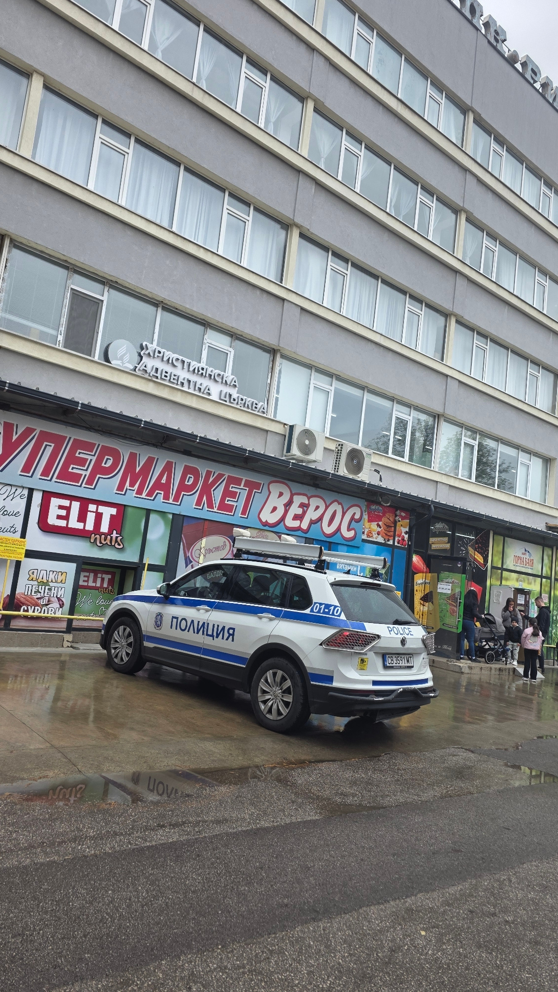 A police car is parked outside a Верос supermarket and Християнска Адвентна Цъква in what appears to be a gray and wet urban setting. Several people are visible on the right side of the image, in fron…read more