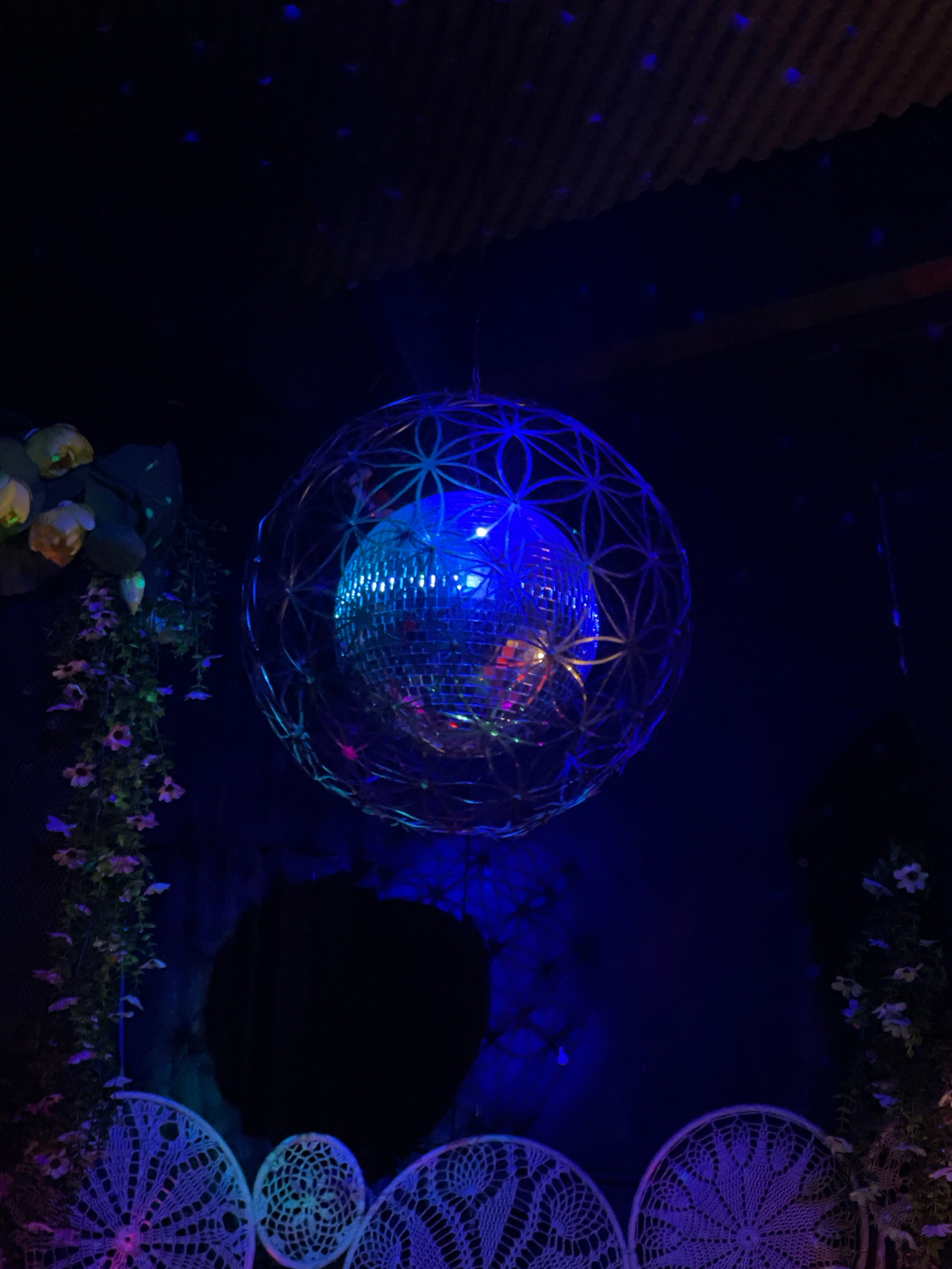 A disco ball surrounded by a geometric metal frame hangs in a dimly lit room, with purple and blue lighting. Three round, lacy decorations are visible in the background on the right. Flowers and green…read more