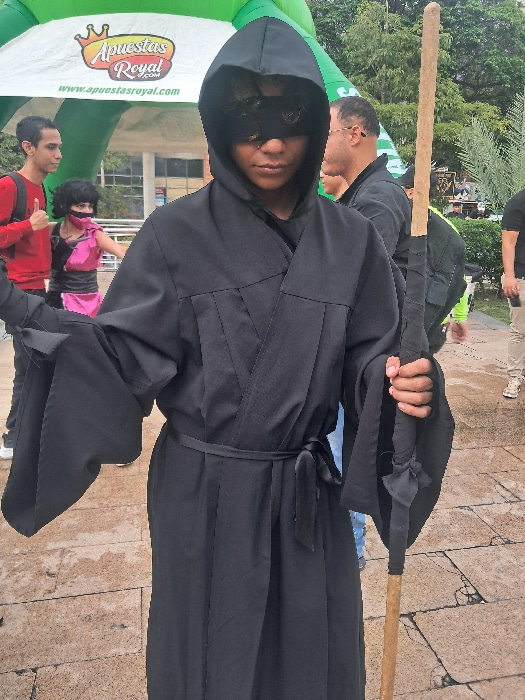 Here is a description of the image: The image depicts an individual dressed in a hooded black robe, resembling a Grim Reaper costume, holding a wooden staff. The person is standing outdoors, near an…read more