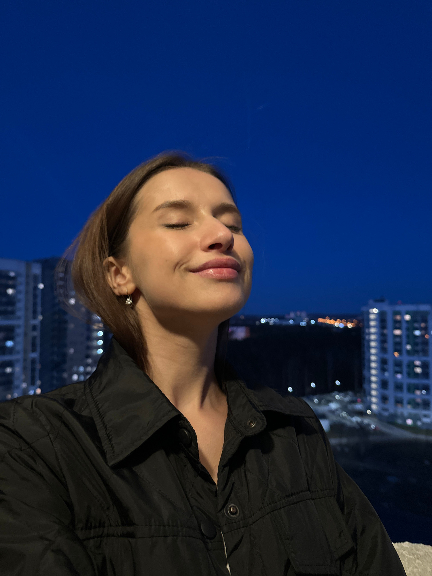 A young woman is depicted in a close-up, rotated portrait taken at night in an urban setting. Her head is tilted upwards, eyes closed, and lips slightly parted, conveying a serene or contemplative expβ¦read more