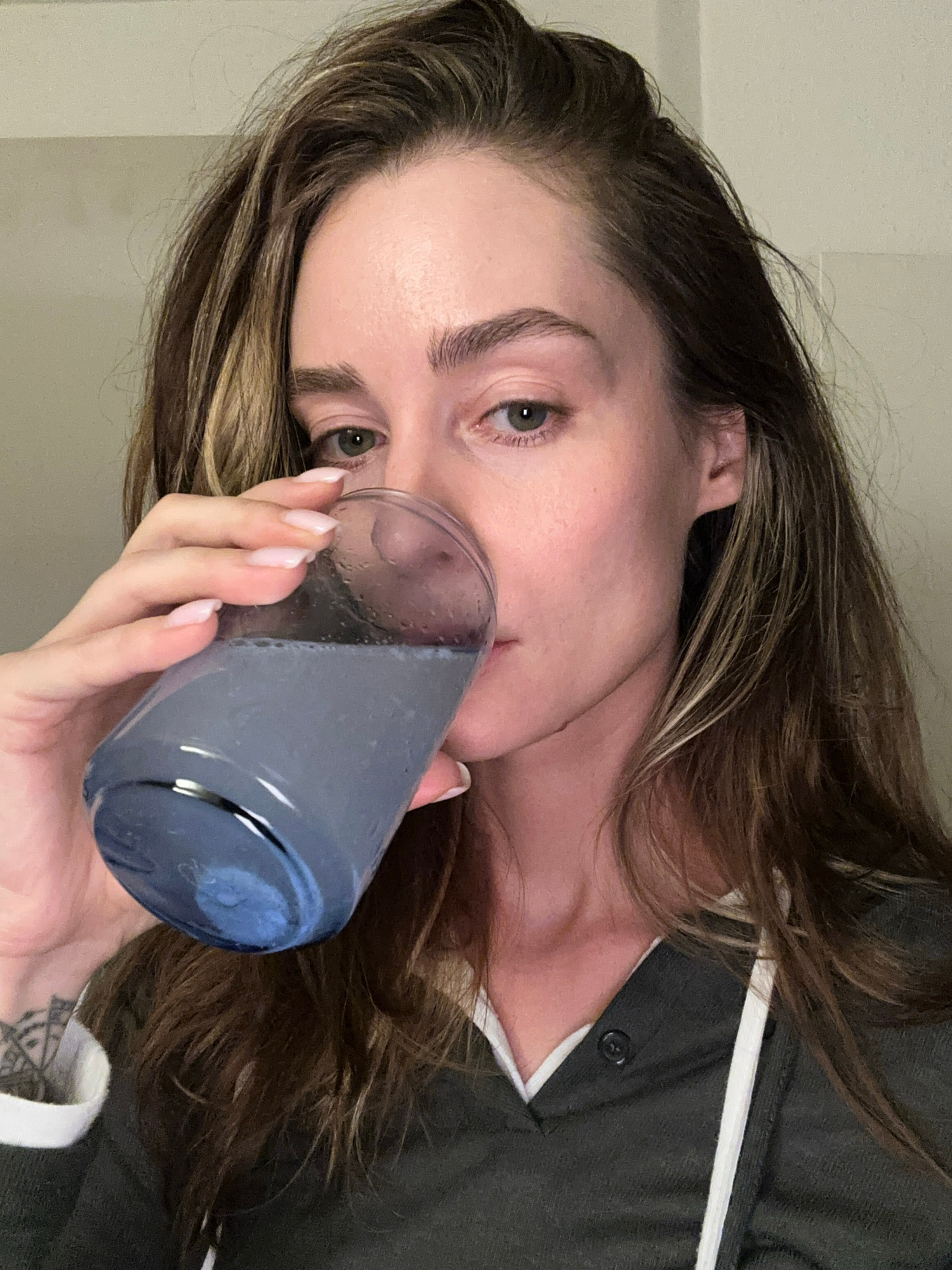 A woman with long brown and blonde hair is holding a blue glass filled with liquid to her mouth. She is wearing a dark grey shirt with a white trim. Her left hand, which features a tattoo on the wrist…read more
